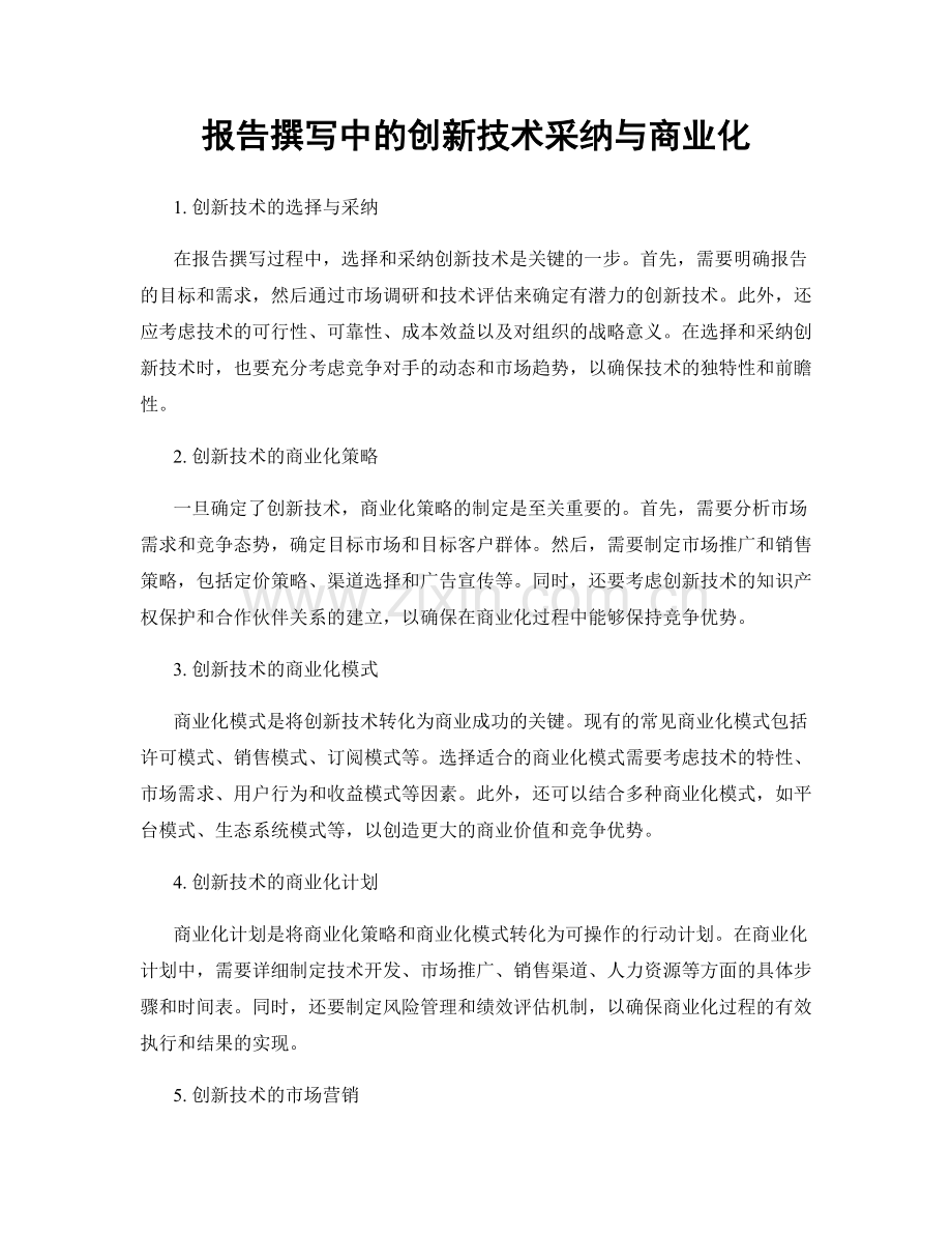 在报告撰写中,创新技术的选择与采纳、商业化策略的制定、商业化模式的选择、商业化计划的制定、市场营销的实施以及商业化风险与挑战的应对是不可或缺的环节。通过科学的方法和系统的思维,可以将创新技术转化为商业成功,实现组织的价值创造和可持续发展。