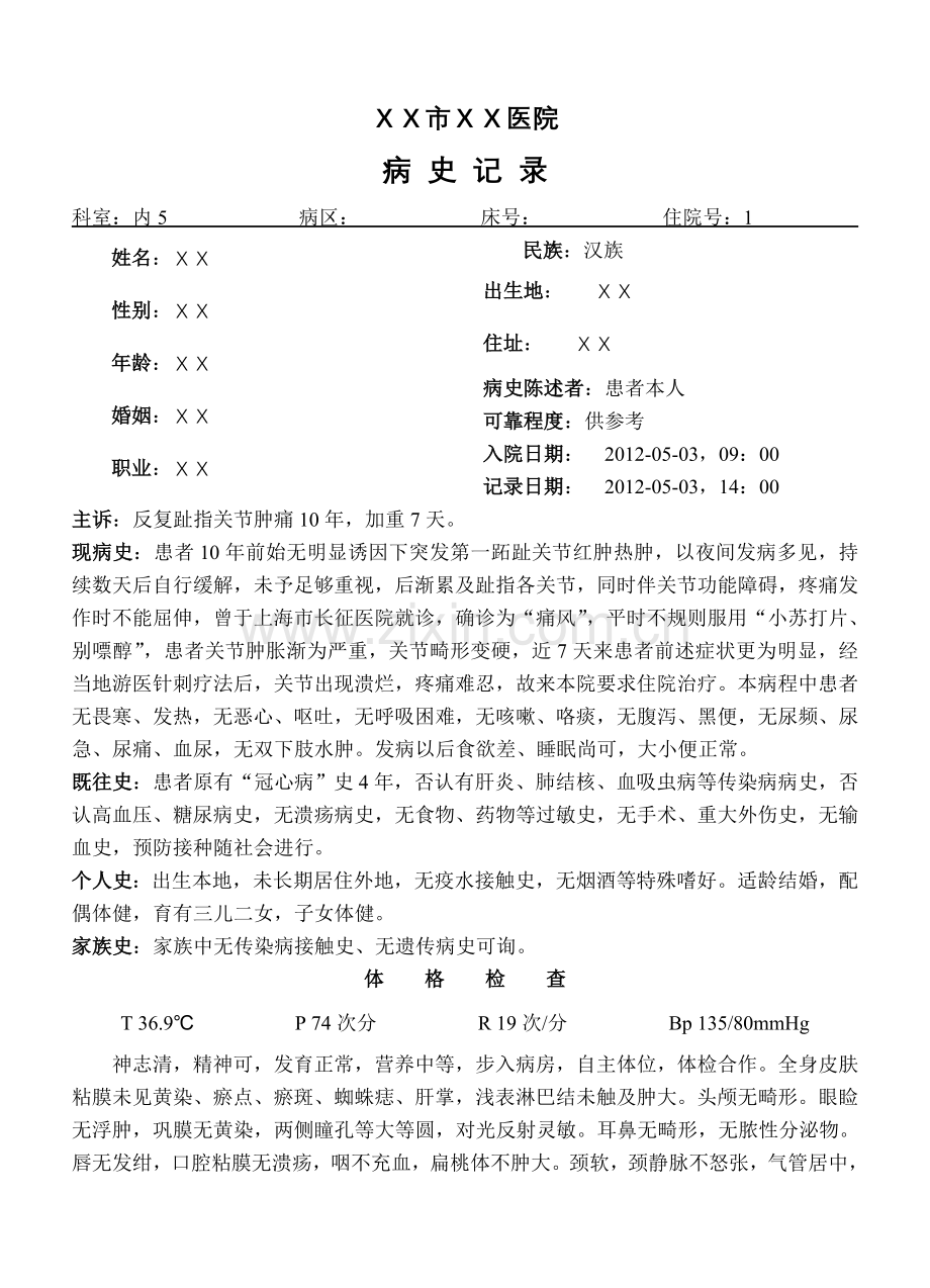 患者ⅩⅩ,ⅩⅩ,ⅩⅩ岁,ⅩⅩ,家住ⅩⅩ,因“反复趾指关节肿痛10年,加重7天” 入院于2012-05-03,09:00。
