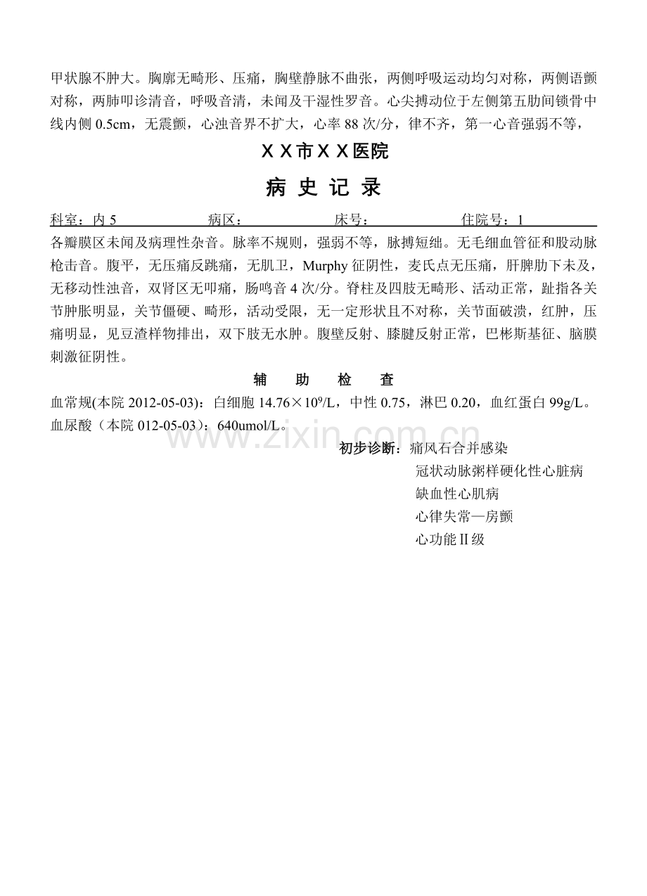 现病史:患者10年前始无明显诱因下突发第一跖趾关节红肿热肿,以夜间发病多见,持续数天后自行缓解,未予足够重视,后渐累及趾指各关节,同时伴关节功能障碍,疼痛发作时不能屈伸,曾于上海市长征医院就诊,确诊为“痛风”,平时不规则服用“小苏打片、别嘌醇”,患者关节肿胀渐为严重,关节畸形变硬,近7天来患者前述症状更为明显,经当地游医针刺疗法后,关节出现溃烂,疼痛难忍,故来本院要求住院治疗。本病程中患者无畏寒、发热,无恶心、呕吐,无呼吸困难,无咳嗽、咯痰,无腹泻、黑便,无尿频、尿急、尿痛、血尿,无双下肢水肿。发病以后食欲差、睡眠尚可,大小便正常。