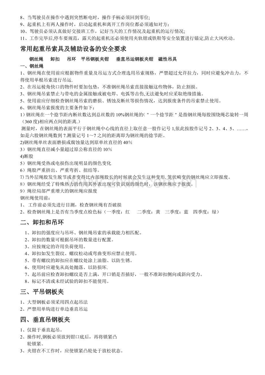 1、必须严格遵守“起重十不吊"的规定(1、超过额定负荷不吊,2、指挥信号不明、重量不明、光线暗淡看不清不吊,3、吊索和附件捆绑不牢,不符合安全要求不吊,4、吊挂重物直接进行加工不吊,5、歪拖斜挂不吊,6、工件上站人或工件上浮放有活动物件不吊,7、多人指挥不吊,8、带棱角快口物件尚未垫好不吊,9、埋在地下的物件未采取措施不吊10、高空吊运遇六级经上大风不吊),同一班组员工必须分工明确不得多人指挥。