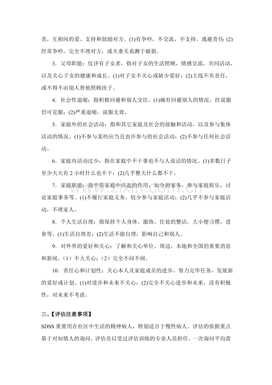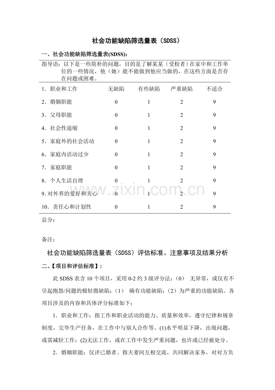 此SDSS表含10个项目,采用0-2约3级评分法:(0) 无异常,或仅有不引起抱怨/问题的极轻微缺陷;(1) 确有功能缺陷;(2)为严重的功能缺陷。各项目涉及的内容和具体评分标准如下: