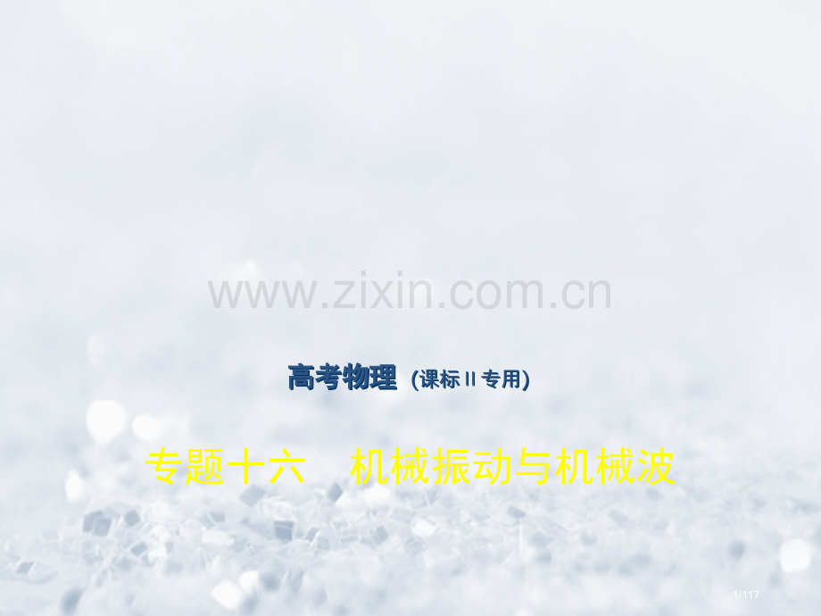 专题十六 机械振动与机械波高考物理高考物理高考物理高考物理(课标课标专用专用)1/117考点一机械振动1.课标,34(1),6分,0.571(多项选择)图(a)为一列简谐横波在t=2s时波形图,图(b)为媒质中平衡位置在x=1.5m处质点振动图像,P是平衡位置为x=2m质点。以下说法正确是()A.波速为0.5m/sB.波传输方向向右C.02s时间内,P运动旅程为8cmD.02s时间内,P向y轴正方向运动E.当t=7s时,P恰好回到平衡位置五年高考A组 统一命题课标卷题组2/117答案ACE由图(a)可知,波长=2m,由图(b)可知周期T=4s,则波速v=0.5m/s,A正确。t=2s时,x=1.5m处质点振动方向向下,则波向左传输,B错。02s时间内P质点运动旅程sP=4A=8cm,C项正确。02s内P质点向y轴负方向运动,D项错。t=0时P质点位于正向最大位移处,故P质点到达平衡位置时刻为t=(2n+1)(n=0,1,2),则n=3时,t=7s,P恰好回到平衡位置,E项正确。考查点振动图像、波动图像思绪分析从振动图像中找出x=1.5m处质点在t=2s时振动方向,利用波动图像中x=1.5m处振动方向判定波传输方向。经过(a)、(b)两图像分别读出波长、周期T、振幅A,进而求出波速v=、质点P运动旅程等。易错警示本题很轻易出现审题错误,误把x=1.5m处振动图像认为是P点振动图像。3/1172.课标,34(1),5分,0.374(多项选择)图(a)为一列简谐横波在t=0.10s时刻波形图,P是平衡位置在x=1.0m处质点,Q是平衡位置在x=4.0m处质点;图(b)为质点Q振动图像。以下说法正确是()A.在t=0.10s时,质点Q向y轴正方向运动B.在t=0.25s时,质点P加速度方向与y轴正方向相同C.从t=0.10s到t=0.25s,该波沿x轴负方向传输了6mD.从t=0.10s到t=0.25s,质点P经过旅程为30cmE.质点Q简谐运动表示式为y=0.10sin10t(国际单位制)4/117答案BCE由图(a)得=8m,由图(b)得T=0.2s,所以v=40m/s。由图(b)知,在t=0.10s时,质点Q经过平衡位置向y轴负方向运动,A错误。结合图(a),由“同侧法”判得波沿x轴负方向传输,画出t=0.25s时波形图,标出P、Q点,如图,此时P点在x轴下方,其加速度向上,B正确。t=0.25s-0.10s=0.15s,x=vt=6m,C正确。P点起始位置不在平衡位置或最大位移处,故D错误。由图知A=0.10m,=10rad/s,所以Q点简谐运动表示式为y=0.10sin10t(国际单位制),E正确。考查点振动图像、波动图像思绪分析结合两图像判断出波传输方向,进而判断出各质点振动方向。结合两图像得出、T、A。分别求出波速及各质点对应时间内旅程。温馨提醒各个质点一个周期内运动旅程为4A,半个周期内运动旅程为2A。5/1173.课标,34(1),5分,0.43如图,一轻弹簧一端固定,另一端连接一物块组成弹簧振子,该物块是由a、b两个小物块粘在一起组成。物块在光滑水平面上左右振动,振幅为A0,周期为T0。当物块向右经过平衡位置时,a、b之间粘胶脱开;以后小物块a振动振幅和周期分别为A和T,则AA0(填“”、“”、“”或“=”)。6/117解析当物块向右经过平衡位置时,脱离前:振子动能Ek1=(ma+mb)脱离后振子动能Ek2=ma由机械能守恒可知,平衡位置处动能等于最大位移处弹性势能,所以脱离后振子振幅变小;由弹簧振子周期T=2知,脱离后周期变小。答案(3分)(2分)考查点简谐运动、弹簧振子解题关键了解弹簧振子系统机械能与振幅相关,a、b脱离,相当于系统机械能降低。了解弹簧振子周期T=2。7/117考点二机械波4.课标,34(1),5分(多项选择)由波源S形成简谐横波在均匀介质中向左、右传输。波源振动频率为20Hz,波速为16m/s。已知介质中P、Q两质点位于波源S两侧,且P、Q和S平衡位置在一条直线上,P、Q平衡位置到S平衡位置之间距离分别为15.8m、14.6m。P、Q开始振动后,以下判断正确是()A.P、Q两质点运动方向一直相同B.P、Q两质点运动方向一直相反C.当S恰好经过平衡位置时,P、Q两点也恰好经过平衡位置D.当S恰好经过平衡位置向上运动时,P在波峰E.当S恰好经过平衡位置向下运动时,Q在波峰8/117答案BDE由波速公式:v=f得=0.8m,LSP=19,LSQ=18,由波动周期性,采取“去整留零”方法,可在波形图上标出S、P、Q三点位置,如图所表示,由图可知,P、Q两点运动方向一直相反,A项错误,B项正确;S在平衡位置时,P、Q一个在波峰,一个在波谷,C项错误;当S恰经过平衡位置向上运动时,P在波峰,Q在波谷,反之则相反,故D、E项正确。考查点波传输特点方法技巧判断在波传输方向上质点运动情况,可求出质点平衡位置和波源间距离与波长关系,采取“去整留零”方法,画出某时刻波形图,确定质点位置。解题关键了解波传输方向与振动方向之间关系。了解波在传输过程中空间上重复性。9/1175.(纲领全国,18,6分)(多项选择)两列振动方向相同、振幅分别为A1和A2相干简谐横波相遇。以下说法正确是()A.波峰与波谷相遇处质点振幅为|A1-A2|B.波峰与波峰相遇处质点离开平衡位置位移一直为A1+A2C.波峰与波谷相遇处质点位移总是小于波峰与波峰相遇处质点位移D.波峰与波峰相遇处质点振幅一定大于波峰与波谷相遇处质点振幅答案AD两列振动方向相同相干波相遇叠加,在相遇区域内各质点仍做简谐运动,其振动位移在0到最大值之间,B、C项错误。在波峰与波谷相遇处质点振幅为两波振幅之差,在波峰与波峰相遇处质点振幅为两波振幅之和,故A、D项正确。考查点波叠加、波干涉思绪分析波峰与波峰相遇点是加强点,波峰与波谷相遇点是减弱点。加强点与减弱点位置都是确定。加强点振幅是A1+A2,不是位移一直保持A1+A2;减弱点振幅是|A1-A2|,不是位移一直是|A1-A2|。易错警示加强点位移也有为零时候,所以不能说加强点位移一定大于减弱点位移。10/1176.课标,34(1),