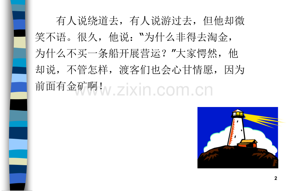 故事成功之道有一次,电视台请了一位商界奇才做主持,大家都很希望有一次,电视台请了一位商界奇才做主持,大家都很希望能听他谈一谈成功之道,但他只淡淡一笑:能听他谈一谈成功之道,但他只淡淡一笑:“还是出道考题考还是出道考题考考你们吧,考你们吧,某地发现了金矿,人们一窝蜂地拥去,然而一某地发现了金矿,人们一窝蜂地拥去,然而一条大河挡住了必经之道,是你,会怎么办?条大河挡住了必经之道,是你,会怎么办?”1有人说绕道去,有人说游过去,但他却微笑不语。很久,他说:“为什么非得去淘金,为什么不买一条船开展营运?”大家愕然,他却说,不管怎样,渡客们也会心甘情愿,因为前面有金矿啊!2 主管主管 船长船长 业务员业务员 乘客乘客 我们的责任就是沿着我们的责任就是沿着基本法基本法指引的成功之道,指引的成功之道,安全快捷地把我们的业务员送往目的地安全快捷地把我们的业务员送往目的地金矿金矿 使大家获得成功!基本法基本法 成功之道成功之道3付出总有回报付出总有回报快乐快乐成成就就自自己己造造就就别别人人增员是一增员是一 种习惯种习惯尝试可能会失败,不尝试肯定一事无成;尝试可能会失败,不尝试肯定一事无成;你想当导演?还是想当演员?你想当导演?还是想当演员?左手抓增员,右手抓业绩;左手抓增员,右手抓业绩;增一个员经过训练成了主管,就像卫星上了太空自己运转,增增一个员经过训练成了主管,就像卫星上了太空自己运转,增员一旦上了轨道,也会自己一路运转下去员一旦上了轨道,也会自己一路运转下去复制成功复制成功4增员的十大好处增员的十大好处75好处一:增员让保险之路不孤单好处一:增员让保险之路不孤单 如果一个人在保险之路独行,面对如如果一个人在保险之路独行,面对如此之大的市场,我们是多么落寞和孤寂,此之大的市场,我们是多么落寞和孤寂,成功时、兴奋时无人分享,痛苦时、失望成功时、兴奋时无人分享,痛苦时、失望时无人分担,自己成功的经验无处传播,时无人分担,自己成功的经验无处传播,也学不到别人的长处,寿险这条路只能越也学不到别人的长处,寿险这条路只能越走越窄,不利于你的发展。走越窄,不利于你的发展。正所谓正所谓“只顾做保单,越走越孤单;天天当伯乐,心情真只顾做保单,越走越孤单;天天当伯乐,心情真快乐!快乐!”86好处二:增员带给你更多成功机会好处二:增员带给你更多成功机会 一个营销员一天六访,只能向六个人宣传保险,一个营销员一天六访,只能向六个人宣传保险,而而100100个营销员一天就可以向个营销员一天就可以向600600个人宣传保险。个人宣传保险。宣宣传面广了,老百姓的保险意识就会逐渐提高,展业环传面广了,老百姓的保险意识就会逐渐提高,展业环境将会逐步宽松,寿险市场就会更加广阔,你自己的境将会逐步宽松,寿险市场就会更加广阔,你自己的成功机会也就更多了。尤其是我们现在的寿险市场,成功机会也就更多了。尤其是我们现在的寿险市场,还处于初级阶段,老百姓的保险意识还不是很强,对还处于初级阶段,老百姓的保险意识还不是很强,对保险甚至还存有某些误会和抱有某些偏见,你的一张保险甚至还存有某些误会和抱有某些偏见,你的一张嘴是说不过千百张嘴的,因此,我们必须借助大多数嘴是说不过千百张嘴的,因此,我们必须借助大多数的力量才能成功。的力量才能成功。请记住请记住 自己做单零售自己做单零售 增员批发增员批发97好处三:增员让保险事业稳健发展好处三:增员让保险事业稳健发展楚汉相争,项羽再强,还是没有打过拥有各种人才的楚汉相争,项羽再强,还是没有打过拥有各种人才的 刘邦团队,最后落了个乌江自刎的下场。刘邦团队,最后落了个乌江自刎的下场。刘备因为增员诸葛亮、关羽、张飞三人,成就刘备因为增员诸葛亮、关羽、张飞三人,成就“三分天三分天 下,鼎足而立下,鼎足而立”的局面的局面李嘉诚、黄伟庆每天有庞大的团队为他们赚钱李嘉诚、黄伟庆每天有庞大的团队为他们赚钱寿险事业也是如此,一个人的能力毕竟有限,寿险事业也是如此,一个人的能力毕竟有限,只有拥有只有拥有庞大的组织队伍,吸引优秀的人才,保险事业才能稳健发庞大的组织队伍,吸引优秀的人才,保险事业才能稳健发展,展,造就别人,成就自己,这样的好事难道你不想做吗?造就别人,成就自己,这样的好事难道你不想做吗?108好处四:增员是提升业绩的不二法门好处四:增员是提升业绩的不二法门 新人有新市场,新人际关系,新思想和新新人有新市场,新人际关系,新思想和新策略,往往策略,往往能给老业务员带来新气息和新启迪,也能给团能给老业务员带来新气息和新启迪,也能给团队带来新的队带来新的血液和活力。因此,增员有利于大家互相学习血液和活力。因此,增员有利于大家互相学习和借鉴,共和借鉴,共同开发市场,共同提升业绩。同开发市场,共同提升业绩。增员是根,业绩是树增员是根,业绩是树FYP=FYP=人力人力人均保费人均保费119好处五:增员可以为更多人提供好处五:增员可以为更多人提供就业机会就业机会 保险讲责任,论人性,需恳谈和服务,这就需要大量保险讲责任,论人性,需恳谈和服务,这就需要大量人员。一个营销员若能造福一百个家庭,那么一百个营销人员。一个营销员若能造福一百个家庭,那么一百个营销