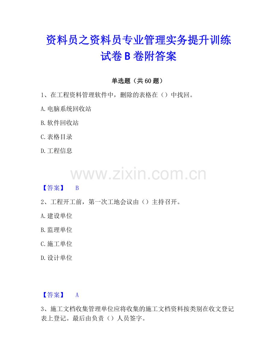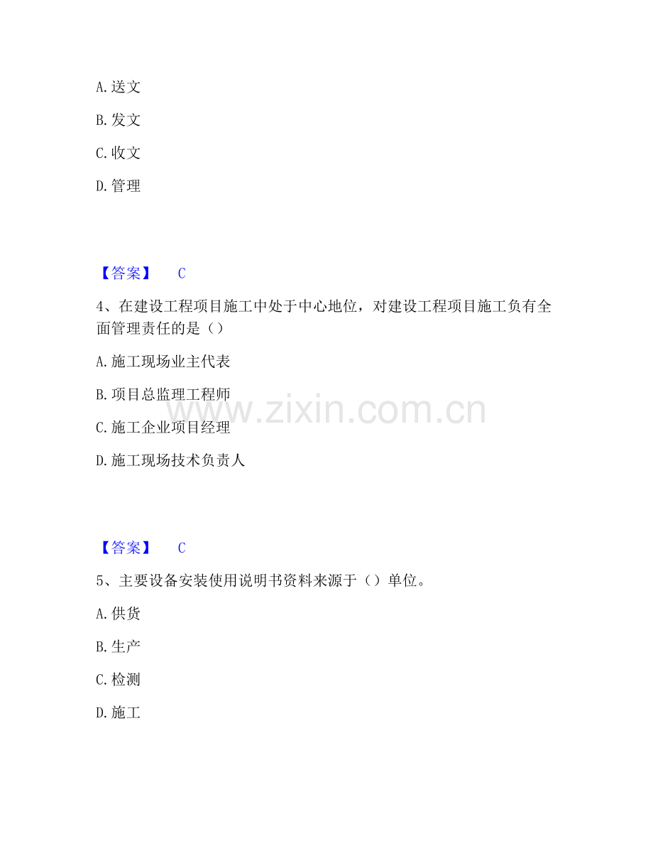 资料员之资料员专业管理实务提升训练试卷 B 卷附答案资料员之资料员专业管理实务提升训练试卷 B 卷附答案单选题(共 60 题)单选题(共 60 题)1、在工程资料管理软件中,删除的表格在()中找回。A.电脑系统回收站B.软件回收站C.表格目录D.工程信息【答案】B2、工程开工前,第一次工地会议由()主持召开。A.建设单位B.监理单位C.施工单位D.设计单位【答案】A3、施工文档收集管理单位应将收集的施工文档资料按类别在收文登记表上登记。最后由负责()人员签字。A.送文B.发文C.收文D.管理【答案】C4、在建设工程项目施工中处于中心地位,对建设工程项目施工负有全面管理责任的是()A.施工现场业主代表B.项目总监理工程师C.施工企业项目经理D.施工现场技术负责人【答案】C5、主要设备安装使用说明书资料来源于()单位。A.供货B.生产C.检测D.施工【答案】A6、建筑业职工文明守则中八不准规定,不准违章作业忽视()。A.安全B.物质堆放C.噪音D.周边环境【答案】A7、施工记录属于()资料。A.质量控制B.功能抽查C.观感D.分部验收【答案】A8、项目监理机构在实施监理过程中,发现工程存在安全事故隐患的,应()。A.口头通知施工单位B.签发监理通知C.签发工程暂停令D.向有关主管部门报送监理报告【答案】B9、立卷时,卷内目录排列在()。A.卷内文件首页之前B.卷盒正表面C.卷盒正背面D.卷内文件尾页之后【答案】A10、对进人施工现场的建筑材料、构配件、设备及器具,按相关标准的要求进行检验,并对其质量、规格及型号等是否符合要求作出确认的活动称为()。A.检验B.进场检验C.见证检验D.复验【答案】B11、编制资料收集目录工作流程有熟悉相关内容确定资料来源、内容及标准编制目录()。A.B.C.D.【答案】A12、工程洽商记录应由()填写一式五份,并应由建设单位、设计单位、监理单位、施工单位保存一份。A.建设单位B.设计单位C.监理单位、施工单位D.提出单位【答案】D13、案卷封面的内容不包涵()。A.档号B.案卷题名C.参与单位D.密级【答案】C14、编码为 C1 的施工资料是()资料。A.施工管理B.施工技术C.施工物质D.进度造价【答案】A15、建筑业职工文明守则中八不准规定,不准偷工减料影响()。A.安全B.成本C.质量D.核算【答案】C16、下列不属于施工资料管理软件的是()。A.PKPM 工程资料软件B.筑业工程资料软件C.恒智天成工程资料软件D.BIM 工程资料软件【答案】D17、技术交底由()编制。A.施工员B.项目技术负责人C.质量员D.交底人【答案】D18、指导检查各项施工资料的正确填写和收集整理是()的资料管理职责。A.项目经理B.项目技术负责人C.专业施工员D.项目专业质量员【答案】B19、施工单位填写的灌水、满水试验记录应一式()份。A.二B.三C.四D.五【答案】B20、建筑工程竣工验收与备案文件建设工程档案与验收意见资料来源是()。A.建设单位B.施工单位C.监理单位D.城建档案馆【答案】A21、水泥试验批量每批不超过()t。A.100B.300C.400D.500【答案】D22、编码为 C7 的施工资料是()资料。A.施工记录B.施工试验记录及检测报告C.施工质量验收记录D.竣工验收记录【答案】C23、建设单位在()应明确工程档案的移交时间。A.工程招标前B.工程招标后C.签订协议、合同前D.签订协议、合同时【答案】D24、项目管理实施规划应由()组织编制。A.企业总经理B.企业部门经理C.项目经理D.质量检测单位【答案】C25、案卷不宜过厚,一般不超过()MM。A.30B.40C.50D.60【答案】C26、建设工程电子归档文件应采用()签名手段,所载内容应真实和可靠。A.手写B.录人C.盖章D.电子【答案】D27、水泥试验报告资料来源单位为()单位。A.施工B.供货C.检测D.监理【答案】C28、施工单位填写的工程定位测量记录应一式()份。A.二B.三C.四D.五【答案】C29、建设工程竣工验收报告进行备案时,应该一式()份。A.4B.5C.6D.7【答案】C30、出厂质量证明文件资料来源单位为()单位。A.施工B.供货C.检测D.监理【答案】B31、钢结构焊接材料试验报告资料来源单位为()单位。A.施工B.供货C.检测D.监理【答案】C32、编码为 C3 的施工资料是()资料。()A.施工管理B.施工物资C.质量验收D.进度控制【答案】D33、对进人施工现场的建筑材料、构配件、设备及器具,按相关标准的要求进行检验,并对其质量、规格及型号等是否符合要求作出确认的活动称为()。A.检验B.进场检验C.见证检验D.复验【答案】B34、工程隐蔽部位经承包人自检确认具备覆盖条件的,承包人应在共同检查前()h 书面通知监理人检查,通知中应载明隐蔽检查的内容、时间和地点,并应附有自检记录和必要的检查资料。A.12B.24C.48D.56【答案】C35、工程概况表资料来源单位为()单位A.施工B.供货C.检测D.监理【答案】A36、建筑工程竣工验收与备案文件设计单位工程质量检查报告资料来源是()。A.建设单位B.施工单位C.监理单位D.设计单位【答案】D37、监理日记由()根据工程具体实施情况填写。A.资料员B.总监理工程师代表C.专业监理工程师D.监理工程师【答案】C38、编码为 C7 的施工资料是()资料。A.施工记录B.施工试验记录及检测报告C.施工质量验收记录D.竣工验收记录【答案】C39、PM 是指()单位。A.总承包B.代建C.项目管理D.专业承包【答案】C40、工程准备阶段文件是()单位在工程开工以前,在立项、审批、用地、勘察、设计、招投标等工程准备阶段形成的文件。A.建设单位B.监理单位C.施工单位D.