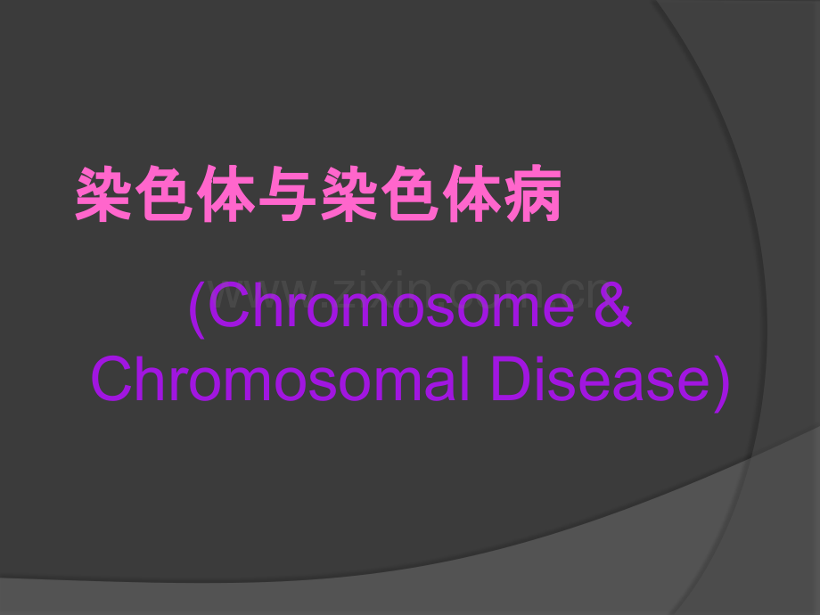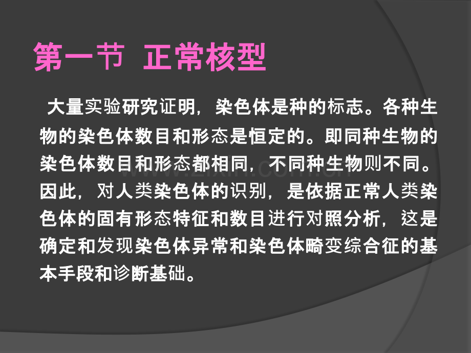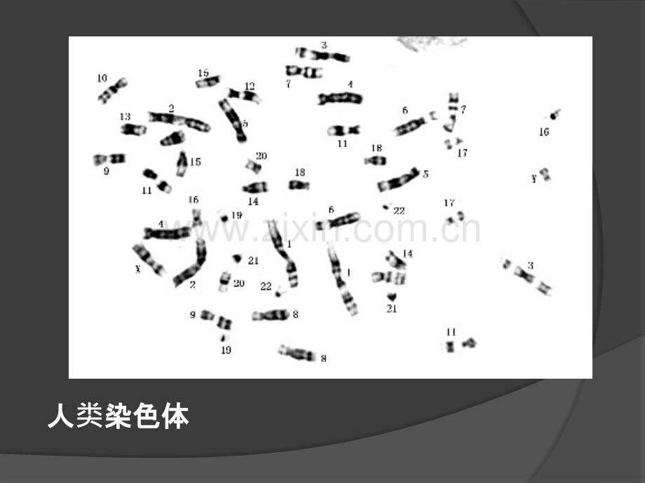 染色体与染色体病染色体与染色体病(Chromosome&Chromosomal Disease)第一第一节 正常核型正常核型大大量量实验研研究究证明明,染染色色体体是是种种的的标志志。各各种种生生物物的的染染色色体体数数目目和和形形态是是恒恒定定的的。即即同同种种生生物物的的染染色色体体数数目目和和形形态都都相相同同,不不同同种种生生物物则不不同同。因因此此,对人人类染染色色体体的的识别,是是依依据据正正常常人人类染染色色体体的的固固有有形形态特特征征和和数数目目进行行对照照分分析析,这是是确确定定和和发现染染色色体体异异常常和和染染色色体体畸畸变综合合征征的的基基本手段和本手段和诊断基断基础。人人类染色体染色体一、人体染色体的形态 染色单体次级缢痕短臂(p)长臂(q)随体常染色质区端粒(异染色质区)随体柄(次级缢痕)着丝粒(初级缢痕)中期染色体结构初初级缢痕(主痕(主缢痕)痕):着着丝粒所在部位两染色粒所在部位两染色单体体缩窄。窄。次次级缢痕痕(副副缢痕):痕):有有的的染染色色体体在在长、短短臂臂上上还存存在在缩窄窄区区或或浅浅染区,称染区,称为副副缢痕。痕。随体:随体:大部分近端着大部分近端着丝粒染色体短臂末端有一球形粒染色体短臂末端有一球形小体,借柄部与染色体主体称小体,借柄部与染色体主体称为随体。随体。NOR:近端着近端着丝粒染色体随体和短臂相粒染色体随体和短臂相连的柄部含有的柄部含有rDNA,可,可转录形成形成rRNA,与核仁形成有关,也称与核仁形成有关,也称核仁核仁组织者区。者区。端粒(端粒(telomere):):染色体端部特化部位,由端粒染色体端部特化部位,由端粒DNA和端粒蛋白构和端粒蛋白构成。成。功能功能:1.维持染色体持染色体结构构稳定;定;2.保持各条染色体彼此不相粘接;保持各条染色体彼此不相粘接;3.有助于同源染色体配有助于同源染色体配对和染色和染色单体互体互换。染色体的四种类型:二、核型分析二、核型分析核型(核型(karyotype):一一个个体体细胞胞(somaticcell)中中的的全全部部染染色色体体称称为核核型型。确确切切的的说核核型型是是指指是是一一个个体体细胞胞内内的的全全部部染染色色体体按按其其大大小小和和形形态特特征征排排列列所所构构成的成的图像。像。对这种种图像像进行分析称行分析称为核型分析。核型分析。核型描述:核型描述:按按国国际标准准,正正常常核核型型的的描描述述包包括括两两部部分分:第第一一部部分分为染染色色体体总数数,第第二二部部分分为性性染染色色体体组成成,两者之两者之间用用“,”隔开隔开:正常男性的核型:正常男性的核型:46,XY正常女性的核型:正常女性的核型:46,XX异异常常核核型型的的描描述述除除包包括括以以上上两两部部分分外外,还包包括括畸畸变情况,也是用情况,也是用“,”与前面部分隔开。与前面部分隔开。(一)非(一)非显带核型核型丹佛丹佛(Denver)体制。体制。规定每一条染色体可通定每一条染色体可通过相相对长度、臂率和着度、臂率和着丝粒指数等三个参数予以粒指数等三个参数予以识别;常染色体按;常染色体按长度度递减的次序以减的次序以122号号编号,性染色体号,性染色体则称称为X和和Y。另外人。另外人类的的46条染色体条染色体应根据根据长度度递减减顺序和序和着着丝粒位置划分粒位置划分为7个易区分的个易区分的组,即以字母,即以字母AG表示表示7组染色体,并决定将副染色体,并决定将副缢痕和随体作痕和随体作为识别染色体的染色体的辅助指助指标。人类染色体核型特点(Denver)分组 序号 大小 着丝粒位置 随体 次缢痕 鉴别A 13 最大 1.3M,2SM 无 1q 可以 B 45 最大 SM 无 难C 612 中等 SM 无 9q 难 X 介于7-8之间 D 1315 中等 ST 有 难 E 1618 中等 16M 无 16q 可以 17、18SMF 1920 次小 M 无 难 G 2122 最小 ST 有 可以 Y 无 Yq大小(二)(二)显带核型核型1968年,年,Caspersson建立染色体建立染色体显带技技术。显带技技术(bandingtechnique):):用用各各种种特特殊殊的的染染色色方方法法使使染染色色体体沿沿长轴显现出出明明暗暗或或深深浅浅交交替替带纹带(band)。)。带型(型(bandingpattern):):将人将人类24种染色体所种染色体所显示各自特殊全部示各自特殊全部带纹,称,称为带型。型。显带染色体界标、区、带命名示意图显带染色体界标、区、带命名示意图 pq3 2 11 2 3 46 4321 51p31人类染色体的显带核型常常见带型的型的类型、特点及型、特点及临床床应用用1.Q带(Qbanding):):Q显 带 用用 芥芥 子子 喹 吖 因因(QM)或或盐酸酸喹吖因因(QH)等等荧光光染染料料对染染色色体体标本本进行行染染色色,然然后后在在荧光光显微微镜下下进行行观察察。但但Q带保保存存时间短短,而而且且需需要要在在荧光光显微微镜下下进行行观察察,因因而而,限限制制了了Q显带技技术的的应用。用。2.G显带(Gbanding):):染染色色体体标本本用用热、碱碱、蛋蛋白白酶等等预处理理后后,再再用用Giemsa染染色色,可可以以显示示出出与与Q带相相似似的的带纹。在在光光学学显微微镜下下,可可见Q带亮亮带相相应的的部部位位,被被Giemsa染染成成深深带,而而Q带暗暗带相相应的的部部位位被被Giemsa染染成成浅浅带。这种种显带技技术称称为G显带。G显带克克服服了了Q显带的的缺缺点点,G带标本本可可