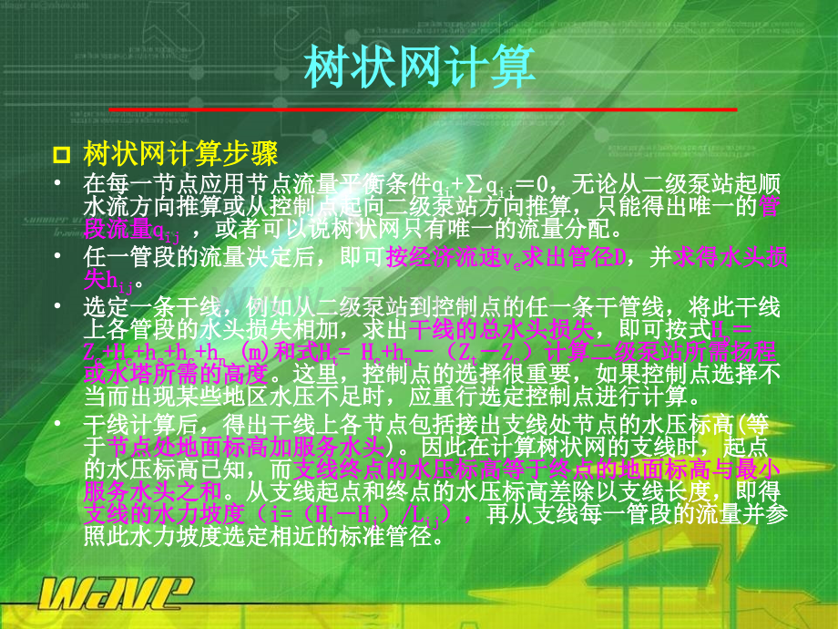 管网水力计算及平差改进第一节第一节 树状网计算树状网计算多数小型给水和工业企业给水在建设初期多数小型给水和工业企业给水在建设初期往往采用树状网,以后随着城市和用水量往往采用树状网,以后随着城市和用水量的发展,可根据需要逐步连接成为环状网。的发展,可根据需要逐步连接成为环状网。村状网的计算比较简单,主要原因是树状村状网的计算比较简单,主要原因是树状网中每一管段的流量容易确定,且可以得网中每一管段的流量容易确定,且可以得到唯一的管段流量。到唯一的管段流量。树状网计算树状网计算p树状网计算步骤树状网计算步骤在每一节点应用节点流量平衡条件在每一节点应用节点流量平衡条件q qi i+q+qijij0 0,无论从二级泵站起顺,无论从二级泵站起顺水流方向推算或从控制点起向二级泵站方向推算,只能得出唯一的水流方向推算或从控制点起向二级泵站方向推算,只能得出唯一的管管段流量段流量q qijij ,或者可以说树状网只有唯一的流量分配。,或者可以说树状网只有唯一的流量分配。任一管段的流量决定后,即可任一管段的流量决定后,即可按经济流速按经济流速v ve e求出管径求出管径D D,并,并求得水头损求得水头损失失h hijij。选定一条干线,例如从二级泵站到控制点的任一条干管线,将此干线选定一条干线,例如从二级泵站到控制点的任一条干管线,将此干线上各管段的水头损失相加,求出上各管段的水头损失相加,求出干线的总水头损失干线的总水头损失,即可按式,即可按式H Hp pZ Zc c+H+Hc c+h+hs s+h+hc c+h+hn n(m)(m)和式和式H Ht t=H=Hc c+h+hn n(Z Zt tZ Zc c)计算二级泵站所需扬程)计算二级泵站所需扬程或水塔所需的高度或水塔所需的高度。这里,控制点的选择很重要,如果控制点选择不。这里,控制点的选择很重要,如果控制点选择不当而出现某些地区水压不足时,应重行选定控制点进行计算。当而出现某些地区水压不足时,应重行选定控制点进行计算。干线计算后,得出干线上各节点包括接出支线处节点的水压标高干线计算后,得出干线上各节点包括接出支线处节点的水压标高(等等于于节点处地面标高加服务水头节点处地面标高加服务水头)。因此在计算树状网的支线时,起点。因此在计算树状网的支线时,起点的水压标高已知,而的水压标高已知,而支线终点的水压标高等于终点的地面标高与最小支线终点的水压标高等于终点的地面标高与最小服务水头之和服务水头之和。从支线起点和终点的水压标高差除以支线长度,即得。从支线起点和终点的水压标高差除以支线长度,即得支线的水力坡度(支线的水力坡度(i=i=(H Hi iH Hj j)/L/Lijij),),再从支线每一管段的流量并参再从支线每一管段的流量并参照此水力坡度选定相近的标准管径。照此水力坡度选定相近的标准管径。树状网计算例题树状网计算例题某城市供水区用水人口某城市供水区用水人口5 5万人,最高日用水量定额为万人,最高日用水量定额为150L150L(人人d)d),要求最小服务水头为,要求最小服务水头为157kPa(15.7m)157kPa(15.7m)。节点。节点4 4接某接某工厂,工业用水量为工厂,工业用水量为400m400m3 3/d/d,两班制,均匀使用。城市地,两班制,均匀使用。城市地形平坦,地面标高为形平坦,地面标高为5.00m5.00m,管网布置见图。,管网布置见图。树状网计算例题树状网计算例题p总用水量总用水量设计最高日生活用水量:设计最高日生活用水量:500000.15=7500m0.15=7500m3 3/d=312.5m/d=312.5m3 3/h=86.81L/s/h=86.81L/s工业用水量:工业用水量:两班制,均匀用水,则每天用水时间为两班制,均匀用水,则每天用水时间为16h 工业用水量(集中流量)工业用水量(集中流量)=400/16=25m3/h=6.94L/s总水量:总水量:Q=86.81+6.94=93.75L/s树状网计算例题树状网计算例题p比流量比流量管线总长度管线总长度L:L=2425m(=2425m(其中水塔到其中水塔到0 0节点的管段两侧无用户,不配节点的管段两侧无用户,不配水,因此未计入水,因此未计入L)比流量比流量qs:q qs s=(Q=(Qq)/Lq)/L 其中,其中,qq(集中流量)(集中流量)=6.94L/s,=6.94L/s,L=2425m=2425m 则则q qs s=(Q=(Qq)/Lq)/L =(93.75-6.94)/2425=0.0358L/(ms)=(93.75-6.94)/2425=0.0358L/(ms)树状网计算例题树状网计算例题p沿线流量沿线流量沿线流量沿线流量q1=qsL:树状网计算例题树状网计算例题p节点流量节点流量节点节点流量流量q qi i=0.5q=0.5q1 1:节点节点4 4除包括流量除包括流量23.80L/s23.80L/s以外,还应以外,还应包括工业用水集中流量包括工业用水集中流量6.94L/s6.94L/s。树状网计算例题树状网计算例题p干管各管段的水力计算干管各管段的水力计算因城市用水区地形平坦,控制点选在离泵站最因城市用水区地形平坦,控制点选在离泵站最远的干管线上的节点远的干管线上的节点8。树状网计算例题树状网计算例题p干管各管段的水力计算干管各管段的水力计算管段流量的确定管段流量的确定 各管段的管段流量等于该管段后所有节点的节点流各管段的管段流量等于该管段后所有节点的节点流量之和量之和q水塔水塔0 q水塔水塔0=q0+q1+q2+q3+q4+q5+q6+q7+q8=93.75L/s=93.75L/sq01 q01=q1+q2+q3+q4+q5+q6+q7+q8=88.38L/s=88.38L/sq14 q14=q4+q5+q6+q7+q8=60.63L/s=60.63L/sq48 q48=q8=11.63L/s=11.63L/s 树状网计算例题树状网计算例题p干管各管段的水力计算干管各管段的水力计算干管各管段管径干管各管段管径D和流速和流速v的确定的确定树状网计算例题树状网计算例题p干管各管段的水