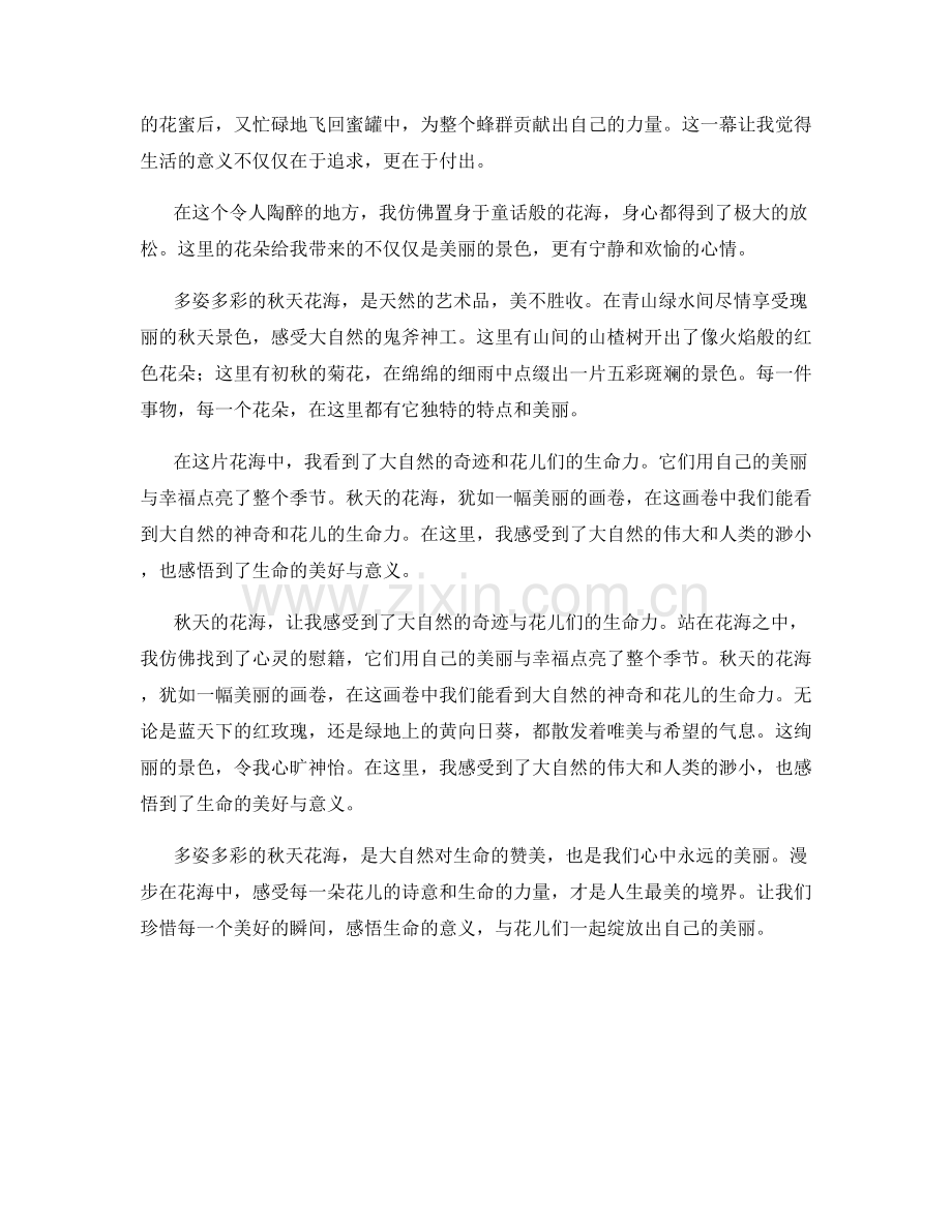 在这片花海中,我看到了大自然的奇迹和花儿们的生命力。它们用自己的美丽与幸福点亮了整个季节。秋天的花海,犹如一幅美丽的画卷,在这画卷中我们能看到大自然的神奇和花儿的生命力。在这里,我感受到了大自然的伟大和人类的渺小,也感悟到了生命的美好与意义。