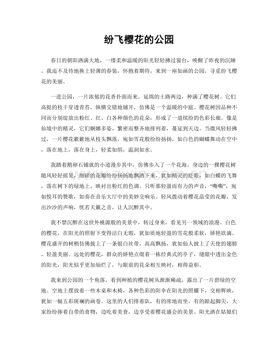 如今,这座美丽的公园成为了人们的心灵聚集地,人们在这里沐浴着春天的阳光,感受纷飞樱花的美妙。轻柔的风儿吹拂,五彩的樱花纷纷扬扬,仿佛是大地上春天的彩带,将公园装点得更加绚丽多姿。在这里,心灵得到了释放,欢乐和梦想在空气中交织,人们的笑容是如此的灿烂。