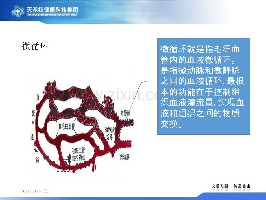 微循环知识与激光知识2024/11/5 周二微循环微循环就是指毛细血管内的血液微循环。是指微动脉和微静脉之间的血液循环,最根本的功能在于控制组织血液灌流量,实现血液和组织之间的物质交换。2024/11/5 周二微循环由谁发现的呢?丹麦的医学家克罗格在1920年率先发现微循环跟人体的生命、健康、疾病乃至寿命有着密不可分的关系。并获得了1920年唯一的一个诺贝尔医学奖。2024/11/5 周二2024/11/5 周二微循环的组成小动脉的终末部分,管壁有完整的弹力腊和数层平滑肌,调节微循环血流量的“总闸门”是微动脉的分支微动脉毛细血管起始部,称为微循环的分闸门后微动脉便于与组织液进行物质交换毛细血管前括约肌真毛细血管最后汇流成微静脉,微循环的后闸门真毛细血管是直接连通微动静脉之间的口径较粗的毛细血管微静脉这种血管无物质交换作用。平时这种血管内无血液流通。通血毛细血管动静脉短路微循环的生理特性管径很细直径只有一根头发丝的二十分之一;血管很长一个成人的微血管连结起来约为9.6万公里,可以绕赤道周径二周半;血流很慢由于压力低所以血流慢0.41毫米/秒;管壁很薄 只有一层内皮细胞和外面的基膜,约为一白纸的1%厚度;数量众多 全身约有100多亿根。2024/11/5 周二微循环的功能物质交换的场所.血液给组织运来氧气、营养物质、激素和水等,带走二氧化碳和代谢产物.沟通全身各组织细胞。调节血流和血量。2024/11/5 周二微循环与健康前苏联著名医学家说:“不管你相信不相信,不管你意识到没意识到,你所治疗的每一种疾病都与微循环有关,微循环状况直接影响疾病的治疗。微循环障碍是百病之源。”微循环是生命最基本的保证。人体额任何器官,任何部位都必须有一个正常的、健康的微循环。否则就会出现相应器官的病变。若微循环不通畅就好像灌溉秧田的水渠堵塞,秧苗得不到水分就干死,树木得不到养分就枯萎。人体微循环功能障碍时机体产生疾病和早衰、早逝的直接原因。2024/11/5 周二微循环障碍所引发的常见疾病系系统/器官器官常常见病病血液循环系统高血压、高血脂、脑动脉硬化、冠心病、脑供血不足、脑梗塞、静脉曲张。呼吸系统慢性咽喉炎、慢性气管炎、肺炎。运动系统风湿、类风湿性关节炎、肩周炎、腰椎间盘突出、颈椎病、腰背痛、四肢寒冷。消化系统消化不良、慢性胃炎、胆囊炎、结肠炎、胃及十二指肠溃疡、痔疮。生殖、泌尿系统肾炎、膀胱炎、痛经、卵巢囊肿、月经不调、前列腺炎、性功能低下。内分泌系统肥胖、糖尿病。皮肤皮肤瘙痒、黄褐斑、黑斑、雀斑、皱坟、冻疮。2024/11/5 周二观察人体的微循环 观察人体微循环的部位有十余个,最常用并且能代表全身微循环状态的主要是甲襞和眼球结膜两个部位。其中甲甲襞是襞是观测人体微循人体微循环状状态的最好窗口的最好窗口。2024/11/5 周二甲襞微循环反射图甲襞是覆盖在指甲根部位的皮肤皱折。甲襞表面为鳞状上皮覆盖,其中有皮肤真皮突起形成的乳头,每一乳头区一般有1-3支毛细血管,此毛细管呈袢状,因此称其为毛细血管袢2024/11/5 周二甲襞微循环的观测指标-三态毛细血管形态毛细血管流态毛细血管袢周状态2024/11/5 周二正常微循环图形状为发夹形,血管直,输入和输出枝平行,血管清晰,排列整齐,分布均匀,数目正常。2024/11/5 周二增宽:高血压、冠心病伴有高血脂、高血粘度等变窄:贫血、急性肾炎、低血压等短小:心脏病、心功能全、水肿、休克超长:小动脉硬化,遗传高血压等异常的微循环及相关疾病2024/11/5 周二异常的微循环及相关疾病畸形:高血压、糖尿病、心脏病、心梗、风湿性关节炎、类风湿等出血:微血管壁的损伤红细胞聚集:形成栓塞2024/11/5 周二典型疾病的实际血管图形示例疾病疾病形形态图例例心脑血管疾病畸形严重,麻花状血管冠心病或有炎症输出枝扩张严重心血管、脑血管疾病畸形严重,鹿角状血管高血压管袢短小低血压血管纤细,管袢清晰度差2024/11/5 周二微循环异常发展方向血瘀、血堵、血栓血液内聚集畸形血粘异常流量缓慢正常流量好心梗、脑梗2024/11/5 周二激光的概念激光激光人类创造的神奇之光激光的最初中文名叫做“镭射”、“莱塞”,是它的英文名称LASER的音译,是取自英文各单词的头一个字母组成的缩写词。意思是“受激辐射的光放大”。激光的英文全名已完全表达了制造激光的主要过程。1964年年按照我国著名科学家钱学森学森建议将“光受激发射”改称“激光激光”。2024/11/5 周二1960年第一台红宝石激光器问世1961年红宝石视网膜激光凝固机在眼科开始使用1963年激光手术开始应用于肿瘤1970年激光开始应用于治疗高血压等内科疾病1975年第一台激光针灸仪开始用于经络治疗疾病1990年俄罗斯将激光能量导入仪带上太空作为宇航员防治太空病重要工具;1991年中国首次引进俄罗斯低强度激光血管内照射治疗技术应用于临床治疗心脑血管病症;1995年发明了半导体激光治疗仪鼻腔照射疗法,取代了血管内照射。1997年发明了半导体激光治疗仪用于手腕上桡动脉的照射治疗。激光的发展与应用2024/11/5 周二激光的分类按照波段分为可见光红外紫外X光等按激光器种类固体气体液体半导体染料等按强度分为强激光弱激光激光的分类2024/11/5 周二激光的三大规律相变规律小剂量兴奋作用,大剂量