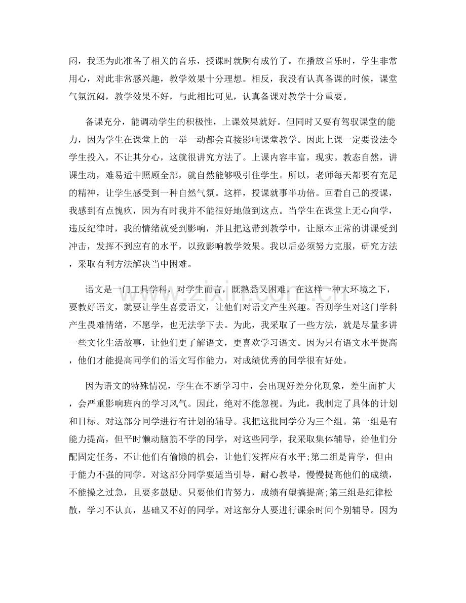 经过一个学期的努力,期末考就是一种考验。无论成绩高低,都体现了我在这学期的教学成果。我明白到这并不是最重要的,重要的是在本学期后如何自我提高,如何共同提高学生的语文水平。因此,无论怎样辛苦,我都会继续努力,多问,多想,多向前辈学习,争取进步。