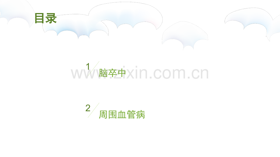 目录目录脑卒中1周围血管病2脑卒中脑卒中脑卒中基本知识01急性缺血性卒中02血栓的形成03脑卒中基本知识脑卒中基本知识 脑的血液供应脑的血液供应正常情况下,心脏把血液泵入脑动脉,脑动脉又逐渐变细成为小动脉,最后变成很细的血管,即毛细血管。毛细血管壁很薄,氧气和营养物质可由此进入脑细胞内。脑的血液供应颈内动脉系统 (前循环)椎-基底动脉系统(后循环)颈内动脉椎动脉基底动脉大脑前动脉大脑中动脉大脑后动脉小脑下后动脉小脑上动脉小脑下前动脉供应大脑前3/5血液和间脑前半部供应大脑后2/5、间脑后半部、小脑及脑干血液脑脑的血液供的血液供应应.椎动脉.颈内动脉脑桥动脉脑桥动脉大脑后动脉大脑后动脉小脑上动脉小脑上动脉小脑下前动脉小脑下前动脉小脑下后动脉小脑下后动脉大大脑脑前前动动脉脉大脑中动脉大脑中动脉【WillisWillis环环】脊脊髓髓前前动动脉脉脊脊髓髓后后动动脉脉后后交交通通动动脉脉前交通动脉前交通动脉基基底底动动脉脉双侧大脑前动脉、颈内动脉、大脑后动脉;前后交通动脉。脑脑的血液供的血液供应应脑脑卒中(卒中(STROKE)脑卒中(Stroke)是脑中风的学名,是一种突然起病的脑血液循环障碍性疾病。又叫脑血管意外。是指在脑血管疾病的病人,因各种诱发因素引起脑内动脉狭窄,闭塞或破裂,而造成急性脑血液循环障碍,临床上表现为一次性或永久性脑功能障碍的症状和体征 卒中可以分为缺血性和出血性。缺血性卒中占70%脑脑卒中卒中临临床分型床分型根据病理性质 (1)缺血性卒中(2)出血性卒中短暂性脑缺血发作脑血栓形成腔隙性脑梗死脑栓塞脑出血蛛网膜下腔出血急性缺血脑性卒中 缺血性卒中缺血性卒中短暂性脑缺血发作短暂性大脑缺血性发作(transient cerebral ischemic attacks,TCIA)是局灶性脑缺血导致突发短暂性、可逆性神经功能障碍。发作持续数分钟,通常在30min内完全恢复,超过2h常遗留轻微神经功能缺损表现,或CT及MRI显示脑组织缺血征象。脑梗死脑梗死是由于脑组织局部供血动脉血流的突然减少或停止,造成该血管供血区的脑组织缺血、缺氧导致脑组织坏死、软化,并伴有相应部位的临床症状和体征,如偏瘫、失语 等神经功能缺失的症候。急性缺血性卒中急性缺血性卒中脑脑卒中的主要症状卒中的主要症状面瘫面瘫不能微笑,口角歪斜不能微笑,口角歪斜肌体无力肌体无力不能伸举上肢、下肢不能伸举上肢、下肢言语困难言语困难吐字不清,沟通困难吐字不清,沟通困难大脑控制着整个身体,所以卒中的症状遍布全身大脑控制着整个身体,所以卒中的症状遍布全身具体出现什么症状,取决于脑组织受损的部位具体出现什么症状,取决于脑组织受损的部位脑脑卒中的症状卒中的症状还有很多其它症状,比如视觉改变、平衡丧失、还有很多其它症状,比如视觉改变、平衡丧失、意识模糊以及记忆缺失。意识模糊以及记忆缺失。脑脑卒中的危卒中的危险险因素因素可调控的危险因素:可调控的危险因素:高血压心脏病糖尿病血脂异常颈动脉狭窄缺乏体力活动吸烟、饮酒肥胖避孕药物不可调控的危险因素:不可调控的危险因素:年龄(55岁后每10年危险性增加1倍)性别(男女之比1.1-1.5:1)种族家族遗传性14危危险险因素与卒中因素与卒中发发生率生率危险因素危险因素脑梗死脑梗死脑出血脑出血高血压高血压增加增加2.3倍倍增加增加4.1倍倍糖尿病糖尿病增加增加3.6倍倍 增加增加2倍倍房颤房颤增加增加2.2倍倍吸烟吸烟增加增加2.55.6倍倍高脂血症高脂血症增加增加1.01.45倍倍年龄年龄55岁岁增加增加1倍倍/10年年常见的六大危险因素常见的六大危险因素F(Face):您(他)是否能够微笑?是否感觉一侧面部无力或者麻木?脑卒中的早期判定FAST评估法 A(Arm):您(他)能顺利举起双手吗?是否感觉一只手没有力气或根本无法抬起?S(Speech):您(他)能流利对答吗?是否说话困难或言语含糊不清?T(Time):如果上述三项有一项存在,请您立即拨打急救电话120。时间就是生命,少一分延误,多一分康复!请立即把患者送入有溶栓治疗经验,有条件和能力为患者进行诊疗的医院救治。脑卒中的早期判定FAST评估法 脑卒中的发展过程危险因素危险因素发展过程发展过程最后结局最后结局潮湿环境潮湿环境酸碱环境酸碱环境各种卒中各种卒中危险因素危险因素水管生锈水管生锈动脉粥样硬化动脉粥样硬化水管阻塞或漏水水管阻塞或漏水脑梗塞或出血脑梗塞或出血急性缺血性卒中急性缺血性卒中分型、临床症状、辅助检查、诊断、治疗急性缺血性卒中分期1、超早期:发病的6小时内。是急性缺血性卒中溶栓治疗的最理想时机。2、早期:发病的672小时内。治疗目的是防止“中心梗死区”扩大,改善周边低灌注区血流供应。3、急性后期:发病的72小时1周内。治疗目的是改善脑组织水肿。使缺血区周边组织功能继续得到改善,是二级预防开始的最佳时期。4、恢复期:发病的一周后6个月期间。尽量减少病残与防治脑梗塞的危险因素,避免脑梗塞复发。5、后遗症期:治疗6个月后时期。经过治疗和锻炼恢复后可使病情进一步得到改善。缺血性卒中病因分类CISS分类缺血性脑卒中缺血性脑卒中Chinese Ischemic Stroke Subclassfication,CISS40%12.3%31.3%5%11.4%急性缺血性卒中病因分类CISS分类p影像检出病灶后,依据影像学显示的病灶大小、部位、血供情况,判断预后
