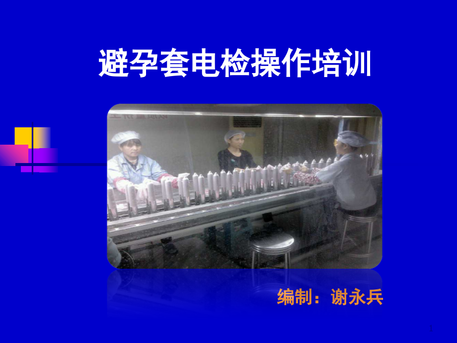 避孕套电检操作培训避孕套电检操作培训编制:谢永兵编制:谢永兵11 12 23 35 5目录避孕套电检操作规程避孕套电检操作规程6 6制程中手法不规范的问题与影响制程中手法不规范的问题与影响避孕套电检方法与操作流程图避孕套电检方法与操作流程图4 48 8电检仪的校验方法电检仪的校验方法7 7针孔漏检原因针孔漏检原因2n 避孕套针孔检查方法有套体充水滚指检查与电子检查两种形式,由于避孕套在浸渍生产过程中会产生有气泡、胶渣杂质,最终形成针孔,因此生产标准上规定需要用漏水试验和电检试验来检查避孕套上有无针孔。电检是电子针孔检查的简称。避孕套针孔检查的定义避孕套针孔检查的定义1 1、3n避孕套-顾名思义就是一种避孕用的医疗器械。使用有“孔”的避孕套,直接后果就是避孕失败。n避孕套也是作为一种有效预防艾滋病等性病传播的工具,使用有“孔”避孕套就有可能染病,威胁人类健康。n针孔检查是避孕套质量检验的主要项目,所有销售的避孕套必须100%经过针孔筛查才能出厂。避孕套针孔检查的必要性避孕套针孔检查的必要性2 2、4n电检设备的两大主要功能是:一、能检查出避孕套上的针孔并保护好品。二、能把查出针孔的避孕套随模具的移动与好品自动分离 n目前市场上对避孕套电检的设备有干法电检与湿法电检,本章介绍的是公司在用的高压湿法电检。n避孕套电检设备也是一种联动线,其运行一周需要经过的过程是模具上套、浸导电液、针孔检测、烘干、卷取、好坏品分离。避孕套电检设备避孕套电检设备3 3、5n避孕套采用高电压湿式电检方法,包括下列步骤:a.将待检避孕套套在金属模具上;b.根据产品的类型、厚薄和生产经验,调节调压器,在300-800V范围内调整施加给检测触头的正电压值,在电检仪灵敏度量程档5-50mA范围内选定或调整电流计的电流值;c.将套了避孕套的金属模具浸入导电液中,浸入水中长度距开口端约20mm,导电液温度 45,浸入时间 8秒;其中导电液选用自来水或阴离子型表面活性剂组合液;d.套体经过导电液时,如果套身有孔(也即不绝缘)则导电液会与模具相通而短路产生一个信号,同时此信号通过数字电路的同步检测器送给PLC做为不合格品记录。避孕套电检原理与操作流程图避孕套电检原理与操作流程图4 4、6电检检测流程图电检仪设定2套套做穿刺3好坏品分离6脱模、套套循环7启动设备1浸导电液检测4卷取57 电检升槽作业流程图烘道升温 1清洁模具2避孕套上机台3模具套套4升水槽5开启电检仪6做穿刺试验7视测出灵敏度调拭电检电压 电流 8启动卷边刷9调节卷取度10好坏品分离11脱模、套套循环128 生产生产n1 当模具清洁干净后,操作人员按要求配戴好手指套,并将需检验的同一型号规格同一批次的产品放置在工作台面上。n2 待烘道温度达到70左右时,电检线人员开始往模具上套待检的产品,每个模具上的套从闭口端到开口端都必须紧贴模具,同时确保没有空模具出现。n3 当套有产品的模具运行到翻板大齿轮时,升电检水槽。上升时注意观察,水槽上升的高度以水液面距避孕套开口端20mm时停止上升;没有套产品的模具不能浸入电检水槽,以免模具进水误检。避孕套电检操作规程避孕套电检操作规程5 5、9n4 启动检测装置,调节检测电压和灵敏度,当模具上套满 产品时,用直径为0.15-0.25钢针穿刺待检品,每边各10只,穿刺位置随机分布,要求随机套在模具上检测时能全部检出,但同时需避免由于电压和灵敏度过高而导致的废品增多。n5 穿刺合格后,当产品从烘道出来时要启动卷边装置,开启卷边,调整好卷边,产品的卷起以压缩空气能轻松吹离为宜,避免卷边辊筒太靠近模具而损伤产品或是远离模具而造成卷起不到位,同时要求卷取处产品不能掉落链板或地上。n6 生产中操作人员应注意每个模具必须套有产品,且产品需紧贴在模具上,不能有鼓胀现象,套产品的力度要一致,避免过度拉伸产品或者力度太小导致产品没有贴紧模具,在套产品时避免套掉落在链板或地面上。操作规程续10 生产过程的监视生产过程的监视n 生产过程中每三小时做一次穿刺试验,如有检不出时,调整检测电压和灵敏度,再次穿剌试验,直到全检为止,更换产品规格类型批次时均需做穿刺实验来调节电压和灵敏度。n 干燥系统的温度调节在70110之间,冬季与夏季视产品干燥度调温,套有产品的模具出烘道进入卷取前须完全干燥,不允许有水珠附着;n 电检满一筐产品需及时换框做好标识,并提交质检员进行抽样检验,生产人员根据检验结果进行必要的调整控制(如返工)。整批产品电检完成后,由质检员抽取老化前爆破试验样品。操作规程续11n 停机操作要求停机操作要求n 当第一个空模离电检水槽下浸端距离10米时,即在操作台套完最后一个产品的同时,通过控制面板点击降槽控件,使电检水槽下降;n停止卷边,关闭烘道控温系统,拔出最后一圈的产品;停止燃烧机;n 清理模具孔洞上的粉垢,保持通气孔的畅通;清洗电检水槽及水槽的溢流口,并将水排除,清除废套等杂物;n 烘道温度低于50时,停止主链;炉膛温度降到40以下时,关闭引风机操作规程续12n高帽-避孕套套体未完全套实紧贴在金属模具上,悬空部份的绝缘电阻加大不能有效检测而漏检。n翻边-卷边处内卷,可导致使用过程中展开不顺。n套不到位-套体拉伸长度不够,会使模具湿水而将好品误检。制程中手法不规范