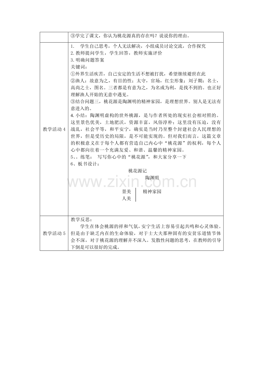 4.小结:陶渊明虚构的世外桃源,是与作者所处的现实社会相对照的。这里景色优美,土地肥沃,资源丰富,风俗淳朴;这里没有压迫,没有战乱,社会平等,和平安宁,确实是当时乃至整个封建社会人民理想的世界,但是受历史的局限,是不可能实现的。但对我们而言,这篇文章的积极意义在于每个人都有营造自己内心中“桃花源”的权利,每个人心中都向往着一个充满友爱、和谐、温馨的精神家园。