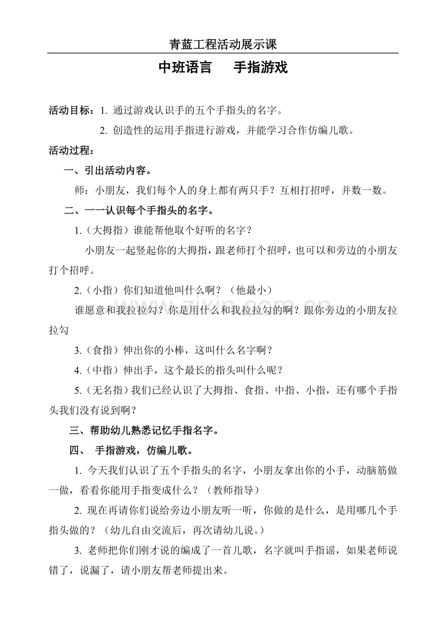 3. 老师把你们刚才说的编成了一首儿歌,名字就叫手指谣,如果老师说错了,说漏了,请小朋友帮老师提出来。