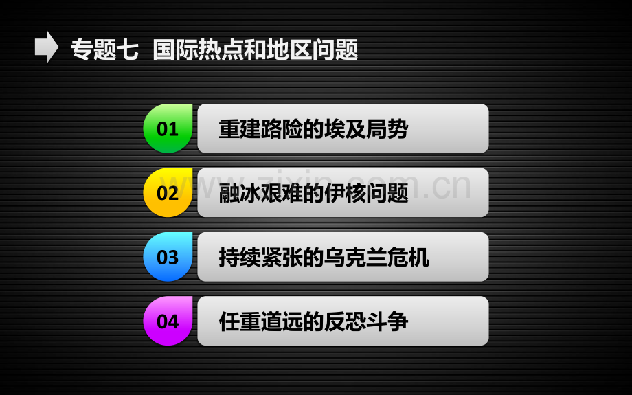专题七 国际热点和地区问题01 重建路险的埃及局势02 融冰艰难的伊核问题03 持续紧张的乌克兰危机04 任重道远的反恐斗争第一讲重建路险的埃及局势一、中国共产党成立的历史条件一、埃及政治转型的困境(一)埃及政治转型的进程及其特点从政治发展进程来看,2011年以来,埃及的政治转型源于威权政权的合法性危机,“125”运动构成了这一转型的逻辑起点。“125”运动本身并不是一场翻天覆地的彻底的政治革命,换言之,无论其经济基础,还是上层建筑,尚没有出现根本性变革。2012年6月30日政治转型的主导力量也从初期的激进革命青年转向伊斯兰力量,伊斯兰政治力量不仅成为中东政坛的新主角,而且在一定时期内主导中东政治转型进程。此后,围绕政治转型主导权的争夺逐渐白热化。2013年7月3日通过“814武力清场行动”以及实施紧急状态、禁止穆斯林兄弟会非法活动等一系列行动,结束了伊斯兰力量(穆斯林兄弟会)主导埃及政治转型的进程,从而使政治转型的主导权重新控制在以军方为首的世俗力量手中。第一讲重建路险的埃及局势一、中国共产党成立的历史条件一、埃及政治转型的困境(一)埃及政治转型的进程及其特点埃及政治转型在短短的两年多时间里波涛汹涌,一波三折,其特点表现为:第一,政治转型呈现出截然不同的两个阶段政治转型进程缺乏连贯性和延续性;政治转型方式经历了从非暴力到暴力、从温和到激进的激烈变化过程。第二,政治转型的主导力量频繁变更,反映了埃及各种社会政治力量(主要指伊斯兰主义者、世俗及自由主义者、军方)此涨彼落,第三,政治转型目标的不确定性。第四,政治转型的无序性、多变性和不可控性。特点第一讲重建路险的埃及局势一、中国共产党成立的历史条件一、埃及政治转型的困境(二)埃及政治转型的困境及其原因众所周知,埃及是一个既有深厚悠久的伊斯兰传统、又有长期世俗主义实践经历的国家,这种双重属性是埃及历史发展进程中形成的,一方面,它塑造了埃及的多元化和多样性社会特性,另一方面,教俗之间的张力常常伴随历史进程而凸现,尤其是在民族国家发展道路选择等问题上形成巨大分歧,由此带来的负面效应直接或间接影响着埃及的政治发展。第一讲重建路险的埃及局势一、中国共产党成立的历史条件一、埃及政治转型的困境(二)埃及政治转型的困境及其原因首先,教俗分歧演变为政治认同上的激烈对抗,造成当前政治转型缺乏共同(共识)的思想基础。其次,政治转型缺乏有效的动力基础。再次,政治转型缺乏坚实的经济基础。最后,埃及政治转型缺乏相对稳定的社会条件。原因第一讲重建路险的埃及局势一、中国共产党成立的历史条件二、埃及政治转型的出路(二)埃及政治转型的困境及其原因国内有专家认为,埃及的政治转型,一是要形成得到多数民众拥戴、能团结各党派、得到军队支持,有权威、有担当的 领导集团,恢复并维持社会稳定;二是要找到一条符合本国国情的发展道路,实行变革,需要借鉴外国模式,但决不 能照搬;三是要切实推动政治、经济、社会、文化全面发展,首要是发展经济,改善民生。上述三个条件缺一不可。西方鼓吹的“民主化”不是埃及转型的重要指标;与此同时,认为埃及变局使“民主化”回到原点,也不符合实际。第一讲重建路险的埃及局势一、中国共产党成立的历史条件二、埃及政治转型的出路(二)埃及政治转型的困境及其原因从现实层面上看,埃及政治转型首先需要解决的是紧迫的民生问题。因为没有经济发展作为支撑,政治转型就难以真正启动,甚至会陷于恶性循环之中。首先当务之急是要为民生问题的解决和经济发展创造一个相对稳定的社会环境,以便能够恢复经济发展,增加就业,改善民生,从而为转型创造条件。其次如何在宗教与世俗之间寻求平衡,塑造包容性政治关系乃是突破埃及政治转型困境的关键。再次政治转型是极其复杂和艰巨的进程,政治转型困境很难通过制宪、选举等途径而改观,相反,在缺乏政治共识的背景下,选举本身很可能激化矛盾,加深分歧并造成更为严重的对抗。第一讲重建路险的埃及局势一、中国共产党成立的历史条件三、2014年埃及政治重建再起航(二)埃及政治转型的困境及其原因由于天气原因,对于穆尔西的审判将推迟到2月1日举行。其实此次推迟已经是对穆尔西审判的第二次推迟了。埃及当下面临着诸多问题,源自于曾有的社会格局被打破,而新的社会结构在当下起伏不定的政治浪潮中依旧未能建立。当前埃及的乱局值得深思。旧体制倒塌并没有带来民主理念,争权夺利在民主和选举的形而上框架中左冲右突,再接着以民主的名义将孱弱的民主体制挤进死角。埃及当下面临的头等大事是需要通过一套普遍认同的政治道路,将整个社会带上共同的重建之路,以此重拾国内的政治信心。第二讲 融冰艰难的伊核问题一、伊核问题历程回顾二战结束以后,伊朗一度成为美国为首的西方国家在中东地区不可或缺的盟友。1953年,在英美等西方国家的策划下,伊朗国内发生政变。1979年,在宗教领袖霍梅尼的领导下,伊朗爆发了伊斯兰革命。2003年初,伊朗宣布掌握铀浓缩技术。2003年12月18日,在英国、法国、德国等国的斡旋下,伊朗正式签署了不扩散核武器条约附加议定书。2004年11月22日,伊朗宣布中止与铀浓缩有关的一切活动。200