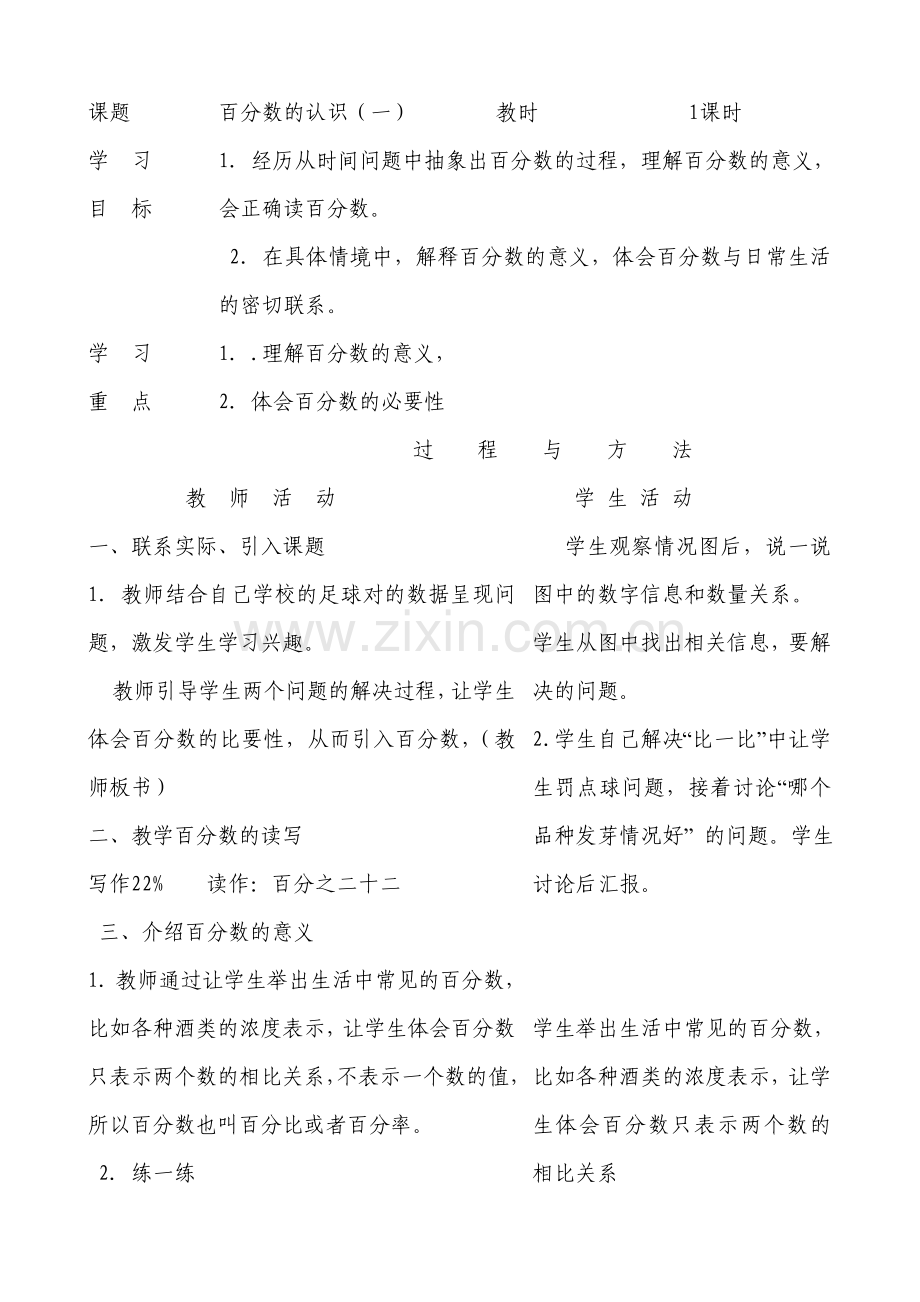 1.教师通过让学生举出生活中常见的百分数,比如各种酒类的浓度表示,让学生体会百分数只表示两个数的相比关系,不表示一个数的值,所以百分数也叫百分比或者百分率。