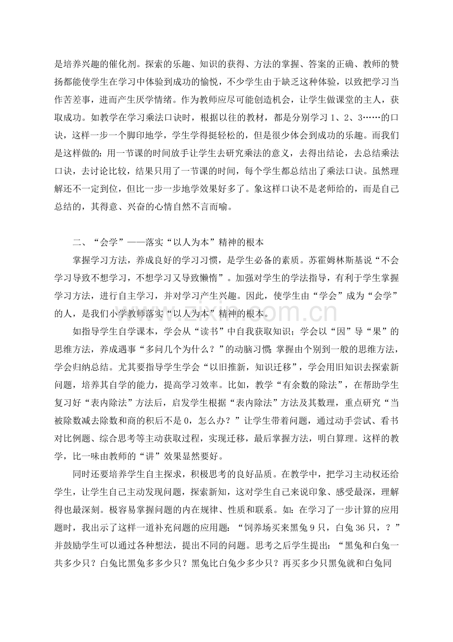 《国家数学课程标准》中明确指出:“教学要以促进学生的发展为中心。”这要求我们在课堂教学中,要从获取知识为首要目标转变为首先关注人的发展,创造一个有利于学生生动活泼、主动发展的教学环境,提供给学生身上充分发展的时间和空间,使课堂成为学生交流学习体会的特殊场所,使学习活动深入生活、溶入社会,真正实现由“以本为本”到“以人为本”的根本性转变。本文就在小学数学教学如何落实“以人为本”精神,促进学生发展试作阐述: