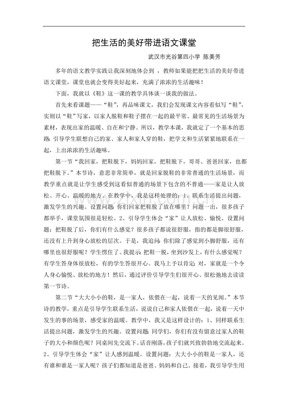 多年的语文教学实践让我深刻地体会到 ,教师如果能把把生活的美好带进语文课堂,课堂也就会变得美好起来,充满了浓浓的生活趣味!