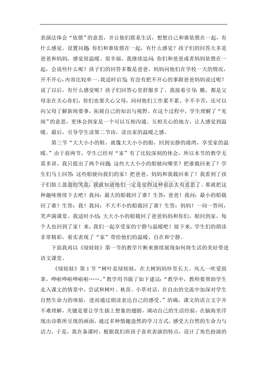 下面我再以《绿娃娃》第一节的教学片断来继续展现如何将生活的美好带进语文课堂。