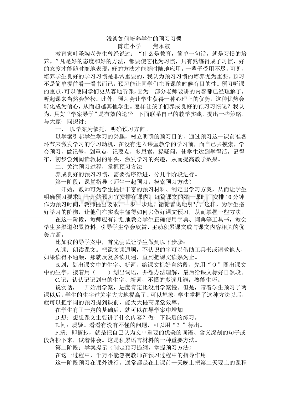 通过一段时间的实践,借助导学案,抓住学生预习兴趣的激发,教给学生预习方法,家校联手的评价,教师的及时动态备课,感觉学生对预习的作用、预习的方法还是有了一定程度的认识,也通过预习提高了学习效率,但一种习惯的养成绝不是在短时间就能完成的,还需要我们付出更多的努力,让学生在预习中找到学习的方法,学习的乐趣。我想只要长期坚持,经常指导,学生养成良好的预习习惯也就指日可待了。