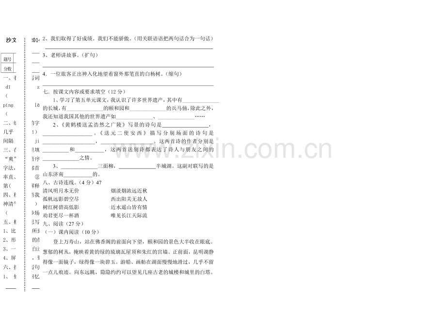 沙文小学2014-2015学年度第一学期四年级语文学科十一月月考试卷
