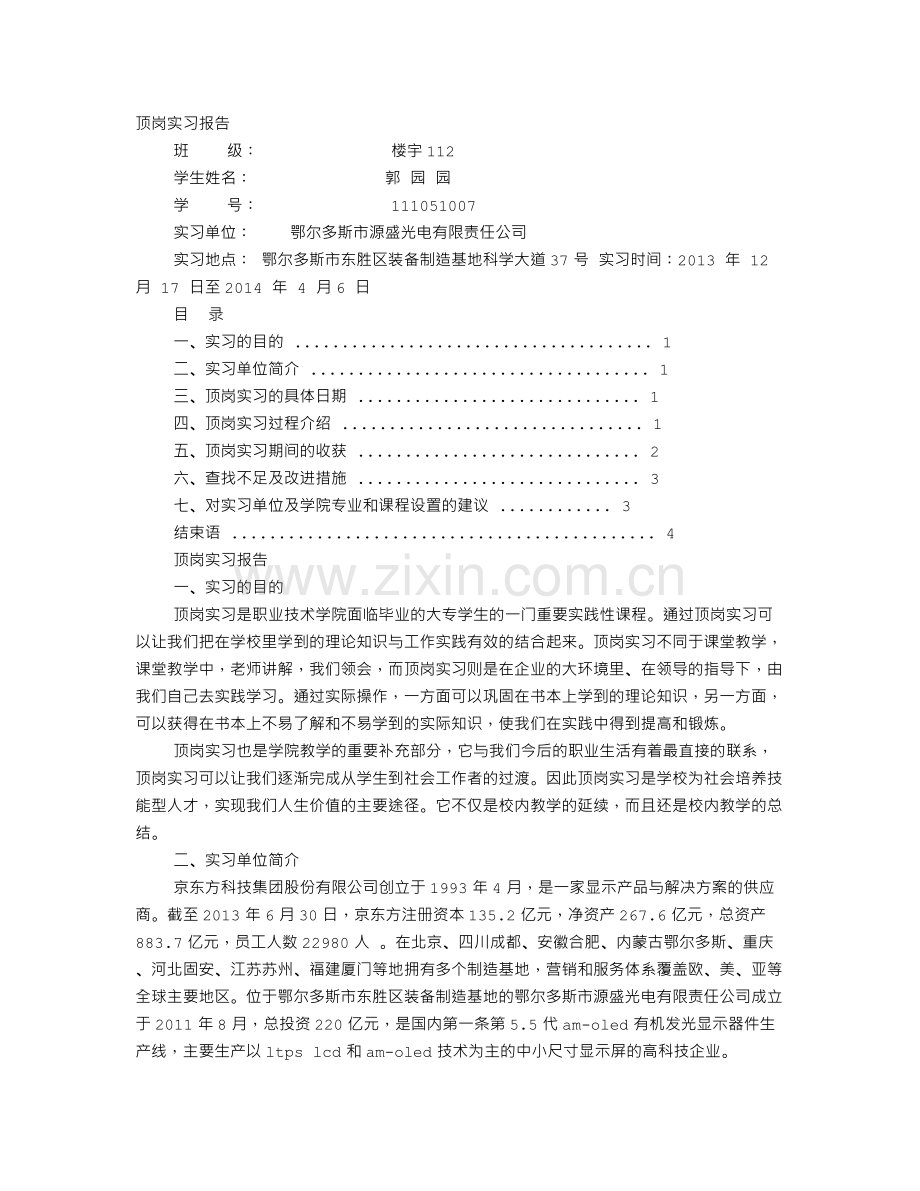 实习地点: 鄂尔多斯市东胜区装备制造基地科学大道37号 实习时间:2013 年 12月 17 日至2014 年 4 月6 日