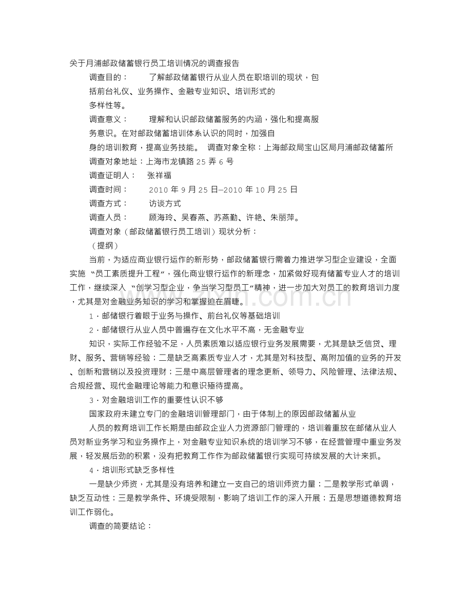 关于月浦邮政储蓄银行员工培训情况的调查报告