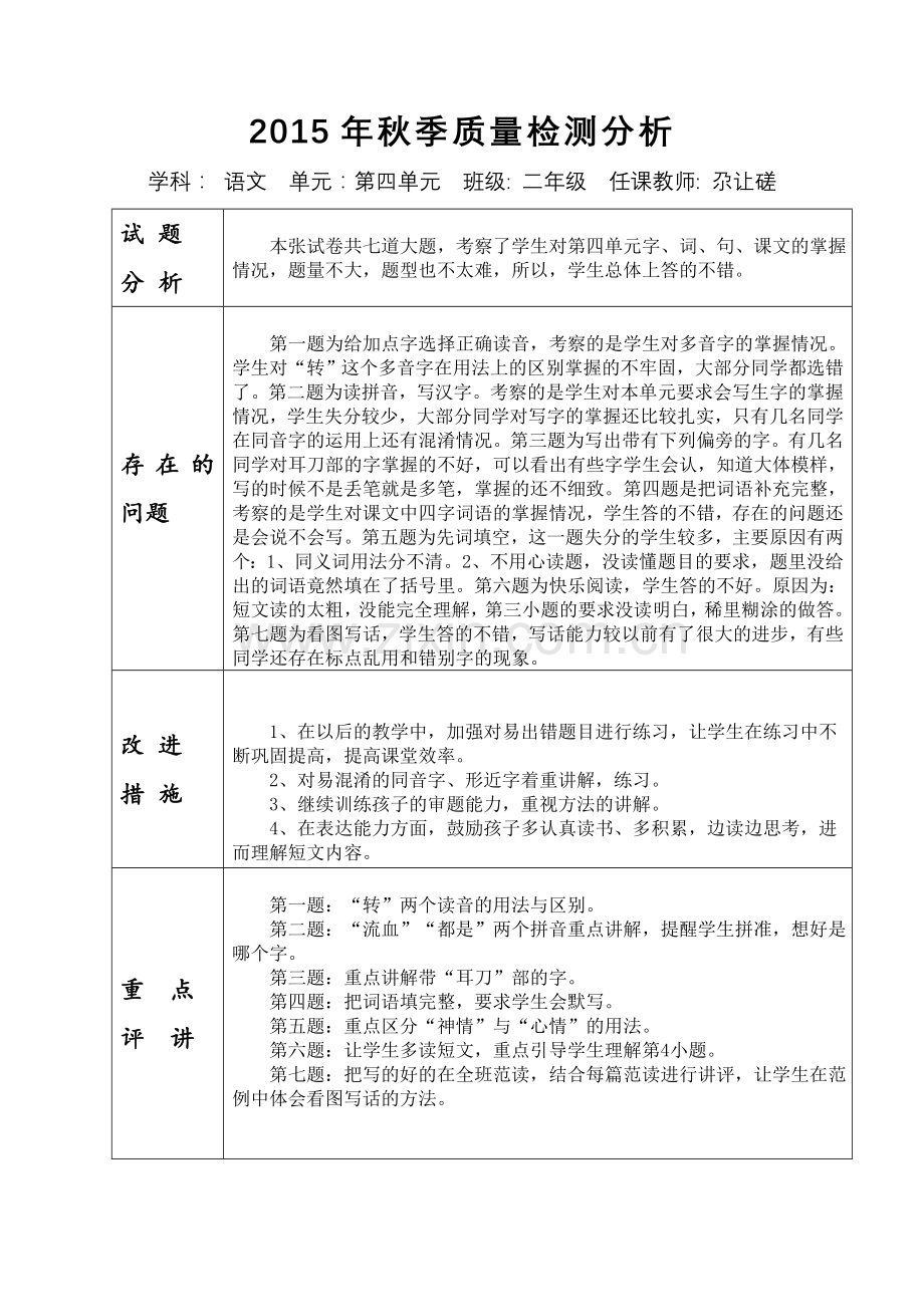 本张试卷共七道大题,考察了学生对第四单元字、词、句、课文的掌握情况,题量不大,题型也不太难,所以,学生总体上答的不错。