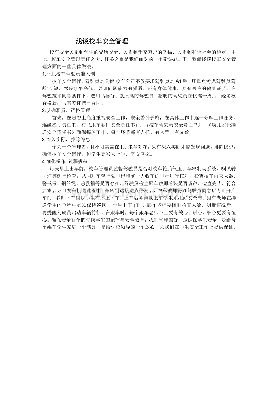 校车安全关系到学生的交通安全、关系到千家万户的幸福、关系到和谐社会的稳定。由此,校车安全管理责任之大、任务之重是我们面对的一个新课题。下面我就谈谈校车安全管理方面的一些具体做法。
