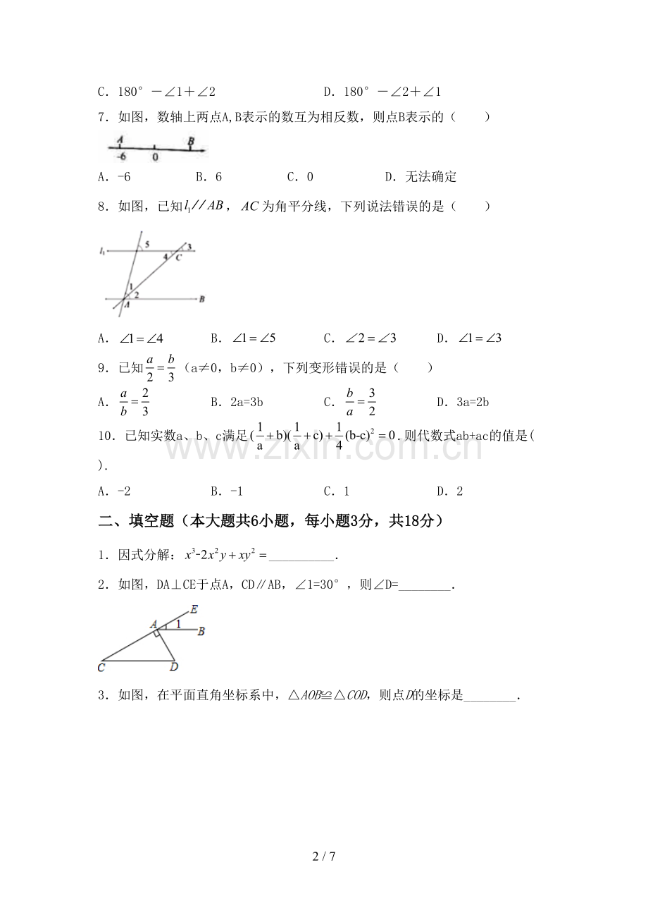 7.如图,数轴上两点A,B表示的数互为相反数,则点B表示的( )