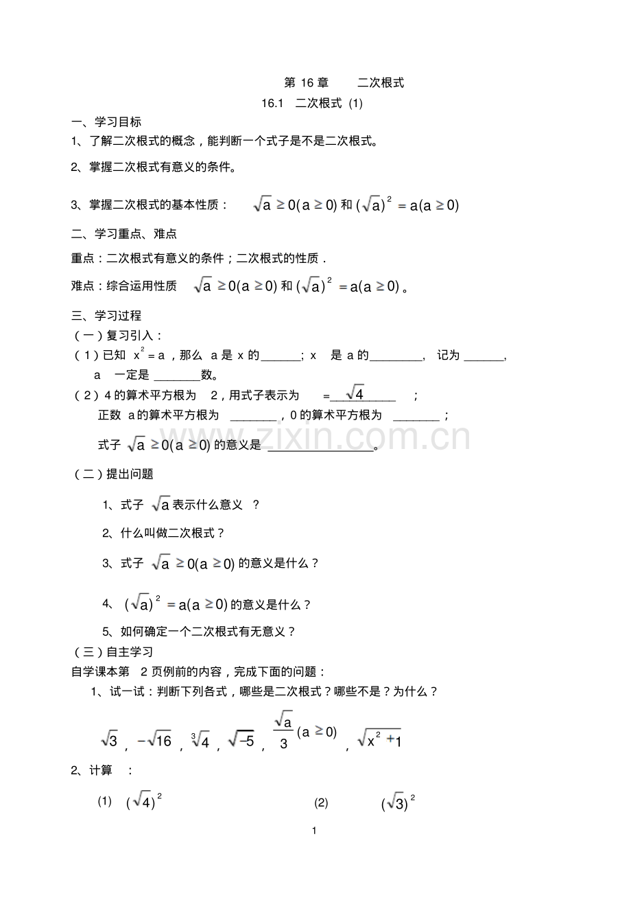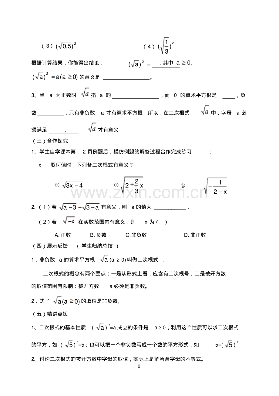 1 第 16 章二次根式16.1 二次根式(1)一、学习目标1、了解二次根式的概念,能判断一个式子是不是二次根式。2、掌握二次根式有意义的条件。3、掌握二次根式的基本性质:)0(0 aa和)0()(2aaa二、学习重点、难点重点:二次根式有意义的条件;二次根式的性质难点:综合运用性质)0(0 aa和)0()(2aaa。三、学习过程(一)复习引入:(1)已知 x2=a,那么 a 是 x 的_;x是 a 的_,记为 _,a一定是 _数。(2)4 的算术平方根为2,用式子表示为 =_;正数 a的算术平方根为_,0 的算术平方根为_;式子)0(0 aa的意义是。(二)提出问题1、式子a表示什么意义?2、什么叫做二次根式?3、式子)0(0 aa的意义是什么?4、)0()(2aaa的意义是什么?5、如何确定一个二次根式有无意义?(三)自主学习自学课本第2 页例前的内容,完成下面的问题:1、试一试:判断下列各式,哪些是二次根式?哪些不是?为什么?3,16,34,5,)0(3aa,12x2、计算:(1)2)4(2)2)3(42(3)2)5.0((4)2)31(根据计算结果,你能得出结论:,其中0a,)0()(2aaa的意义是。3、当a 为正数时指 a 的,而0 的算术平方根是,负数,只有非负数a 才有算术平方根。所以,在二次根式中,字母a 必须满足 ,才有意义。(三)合作探究1、学生自学课本第2 页例题后,模仿例题的解答过程合作完成练习:x取何值时,下列各二次根式有意义?43x223x2、(1)若33aa有意义,则a 的值为 _(2)若在实数范围内有意义,则x 为()。A.正数B.负数C.非负数D.非正数(四)展示反馈(学生归纳总结)1非负数a 的算术平方根a(a 0)叫做二次根式.二次根式的概念有两个要点:一是从形式上看,应含有二次根号;二是被开方数的取值范围有限制:被开方数a 必须是非负数。2式子)0(aa的取值是非负数。(五)精讲点拨1、二次根式的基本性质(a)2=a 成立的条件是a0,利用这个性质可以求二次根式的平方,如(5)2=5;也可以把一个非负数写成一个数的平方形式,如5=(5)2.2、讨论二次根式的被开方数中字母的取值,实际上是解所含字母的不等式。_)(2ax21x
