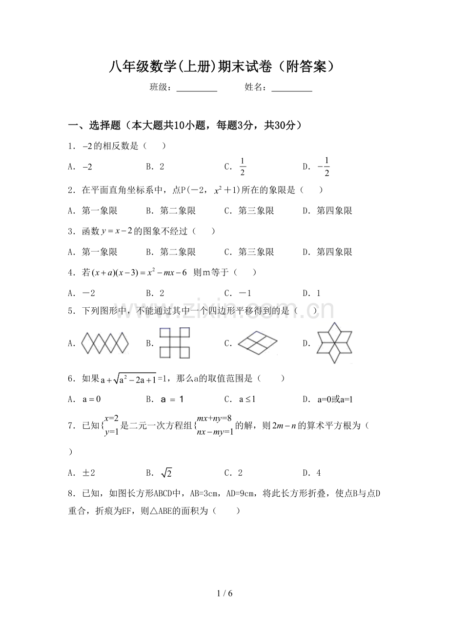 2.在平面直角坐标系中,点P(-2,+1)所在的象限是( )