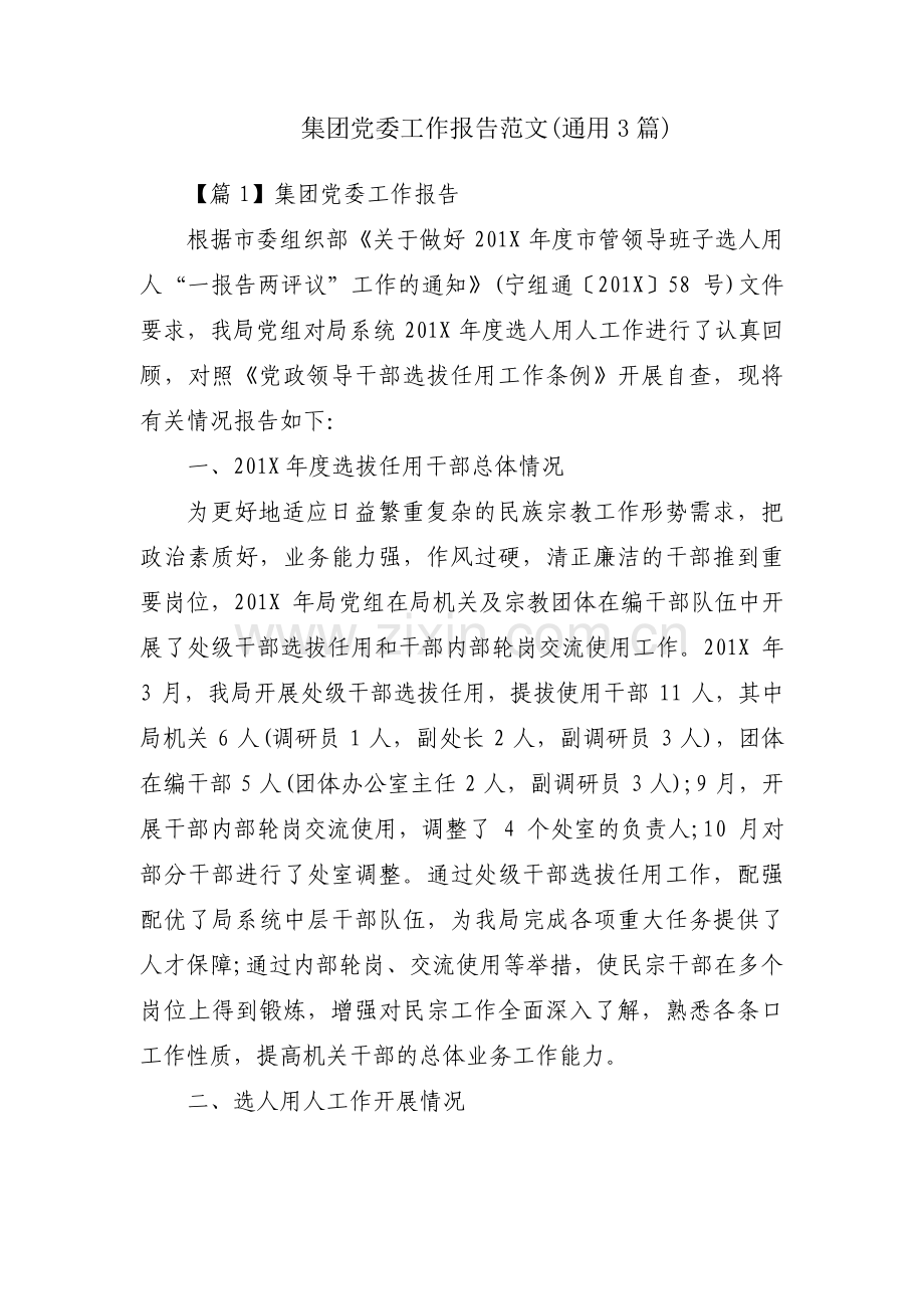 集团党委工作报告范文(通用 3 篇)【篇 1】集团党委工作报告 根据市委组织部关于做好 201X 年度市管领导班子选人用人“一报告两评议”工作的通知(宁组通201X58 号)文件要求,我局党组对局系统 201X 年度选人用人工作进行了认真回顾,对照党政领导干部选拔任用工作条例开展自查,现将有关情况报告如下:一、201X 年度选拔任用干部总体情况 为更好地适应日益繁重复杂的民族宗教工作形势需求,把政治素质好,业务能力强,作风过硬,清正廉洁的干部推到重要岗位,201X 年局党组在局机关及宗教团体在编干部队伍中开展了处级干部选拔任用和干部内部轮岗交流使用工作。201X 年3 月,我局开展处级干部选拔任用,提拔使用干部 11 人,其中局机关 6 人(调研员 1 人,副处长 2 人,副调研员 3 人),团体在编干部 5 人(团体办公室主任 2 人,副调研员 3 人);9 月,开展干部内部轮岗交流使用,调整了 4 个处室的负责人;10 月对部分干部进行了处室调整。通过处级干部选拔任用工作,配强配优了局系统中层干部队伍,为我局完成各项重大任务提供了人才保障;通过内部轮岗、交流使用等举措,使民宗干部在多个岗位上得到锻炼,增强对民宗工作全面深入了解,熟悉各条口工作性质,提高机关干部的总体业务工作能力。二、选人用人工作开展情况 我局始终坚持正确的选人用人导向,认真贯彻党的干部路线方针政策,严格执行党政领导干部选拔任用的各项规定,不断完善工作机制,使真正使想干事的人有平台,能干事的人有机会。(一)严格执行干部选拔任用条例。局党组在干部选拔任用工作中,严格执行党政领导干部选拔任用工作条例的相关规定,坚持选人用人原则,在干部素质标准上坚持德才兼备、以德为先的原则;在干部能力要求上坚持注重实绩、群众公认的原则,在选拔干部过程中坚持民主、公开、竞争、择优和民主集中制的原则,营造了有利于优秀人才脱颖而出、健康成长的发展环境。(二)严格规范干部选拔任用程序。201X 年初,局党组根据局机关及宗教团体实际工作需要,经过充分酝酿,提出启动局机关及团体处级干部选拔任用工作的意见。局办公室(人教处)对局机关及团体在编干部队伍情况进行分析梳理,结合处级职位和干部队伍实际情况制定了南京市民族宗教事务局处级干部选拔任用工作实施方案和南京市宗教团体(基督教青年会)在编干部副处级选拔任用工作实施方案,经局党组研究并报市委组织部和市人社局同意,于 201X 年 3 月在局机关和团休在编干部中开展处级干部选拔任用工作。工作中我局严格按照方案组织实施,召开干部大会公开岗位和职数,规范个人申请报名、资格审核、竞职演讲、民主推荐、组织考察、公示的各个环节。选拔过程中紧紧把握民主推荐、考察、酝酿等重要环节,不搞形式,不走过场,公正公开,接受监督,切实做到组织严密,程序合法。(三)严格按核定职数配备干部。选拔任用工作开展前,我局对职数情况进行分析,根据条例规定,对照干部任职资格,对干部队伍情况进行梳理统计。为更加有效合理地确定职数职位,局党组进行充分酝酿、规划布局,并多次到市委组织部、市人社局征求指导意见,在核定的处级职数范围内能最大限度地调整使用干部,真正把能力强、素质好、作风硬,群众信任的干部选拔到领导岗位上来。201X 年我局 3 次调整使用干部,均未出现超职数配备的现象。(四)严格遵守组织人事纪律。在干部选拔任用工作中,我局切实遵守组织人事工作纪律,局党组书记率先垂范、以身作则,严格按照条例规定的程序和纪律办理,在提名、讨论等各个环节上,认真听取各方面的意见,不搞个人说了算。工作中我局坚持做到职位职数公开、任职条件公开、竞聘人员名单公开、考察对象公开等,坚决落实群众的知情权、参与权、选择权、监督权,使我局干部任用工作得到干部群众的认可和肯定。三、存在问题及改进措施 201X 年,我局干部选拔任用工作按照相关规定和程序圆满完成,但在实践过程中还存在一些问题。比如选人用人的视野不够开阔。由于编制受限,近些年我局只能通过接收转业干部的方式充实工作队伍,单一的进人渠道造成了干部队伍年龄结构偏大,人员梯次不合理。在选拔干部的过程中个别岗位还存在着论资排辈的现象。在今后选拔任用干部中,还需要进一步解放思想,大胆提拔使用有能力、有担当的年轻干部,在营造健康向上、积极进取的氛围上下功夫,着力激发干部动力、活力、创造力,培养干部想干事、能干事、会干事、干成事的全面素质,形成人人思发展、人人谋发展的良好局面。今后,我局还将进一步贯彻落实条例有关规定,完善干部选拔任用机制,不断总结干部竞争上岗、选拔任用所取得的经验,努力形成人尽其才,充满活力的用人机制。培养好、选配好、使用好干部。【篇 2】集团党委工作报告 党的十七次人民代表大会报告指出,要“坚持正确用人导向,按照德才兼备、注重实绩、群众公认原则选拔干部,提高选人用人公信度”。我们要正确理解、准确把握干部工作原则,旗帜鲜明地坚持正确的用人导向,把真心实意想干事、勤奋学习会干事、务求实效干成事、严于律己不出事的干部选拔到重要领导岗位上来。一、坚持德才兼备原则 德才兼备,要求始终把干部的思想政治素质摆在首位。“才者,德之资也;德者,才之帅也。”合格的