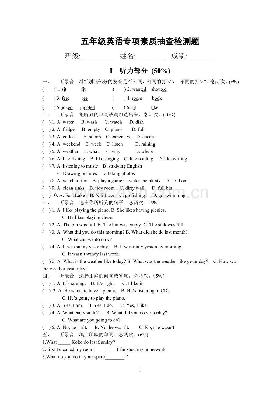 四、听录音,选择正确的问句或答句。念两次。(5%)(5分)