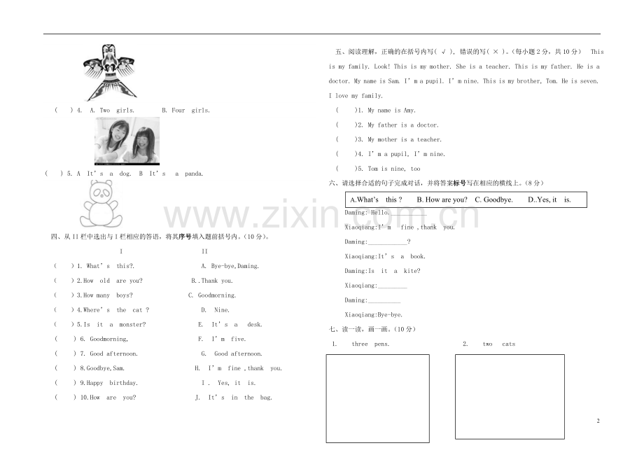 五、阅读理解,正确的在括号内写( √ ), 错误的写( × )。(每小题2分,共10分) This is my family. Look! This is my mother. She is a teacher. This is my father. He is a doctor. My name is Sam. I’m a pupil. I’m nine. This is my brother, Tom. He is seven. I love my family.
