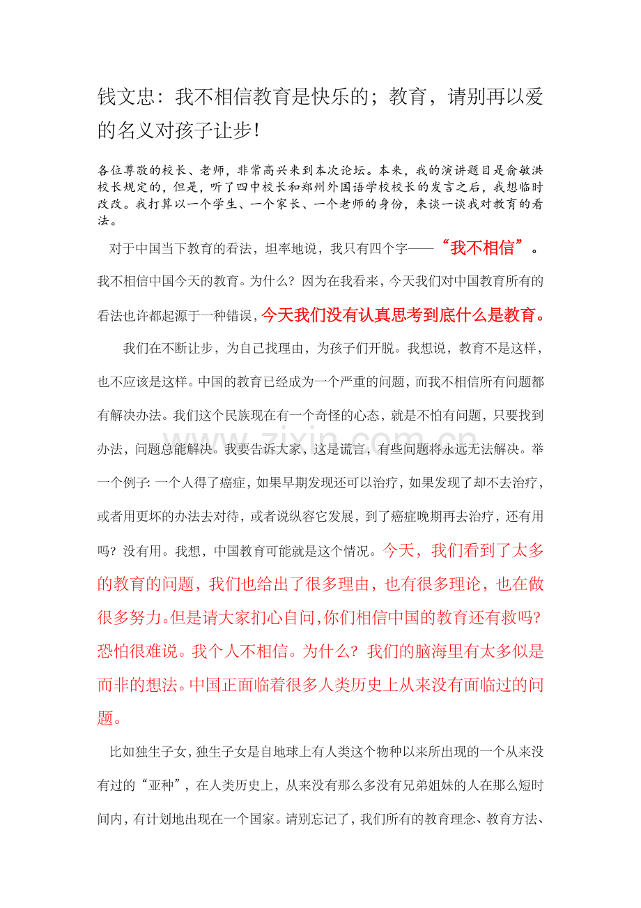 只有这样,经过几十年的努力,我大概在那时候还能考虑让我的孙子留在国内受教育。这是我的真心话,有不对的地方,请各位校长首先把我当成一个学生,其次把我当成一个家长,最后把我当一个晚辈老师,给予批评教育。我刚才讲的没有一句假话,全是真话。当然,季羡林先生教过我“假话全不说,真话不全说。”