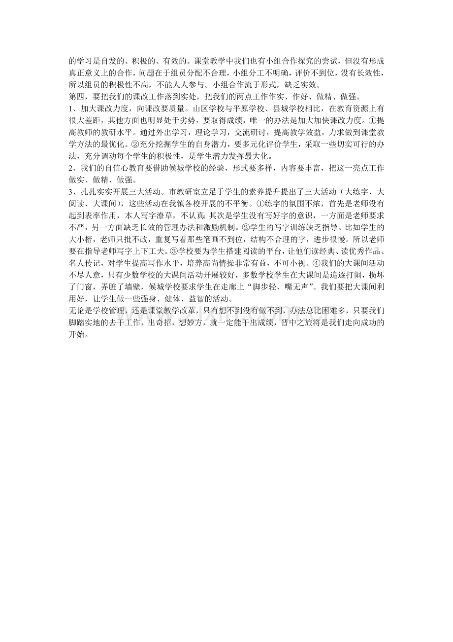 无论是学校管理,还是课堂教学改革,只有想不到没有做不到,办法总比困难多,只要我们脚踏实地的去干工作,出奇招,想妙方,就一定能干出成绩,晋中之旅将是我们走向成功的开始。