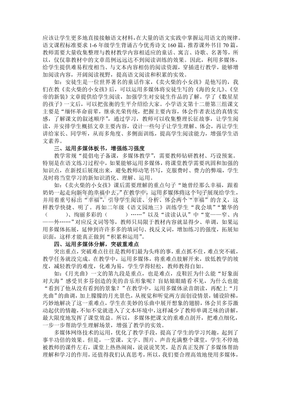 多媒体网络技术的运用,优化了教学手段,提高了学生的学习兴趣,起到了事半功倍的效果。但是,一堂课,文字、图片、声音充满整个课堂,学生不停地被教师的课件左右,课堂上热热闹闹,说说说笑笑,是否真正发挥了多媒体帮助理解和学习的作用,还值得我们认真思考,所以,我们要合理高效地使用多媒体,巧妙地预设教案,将有声、有形、有画的过程安排到合适的教学环节,抓住重难点,多渠道给学生提供学习资料,多方面、多角度加强练习,才能真正使语文课堂教学高效。