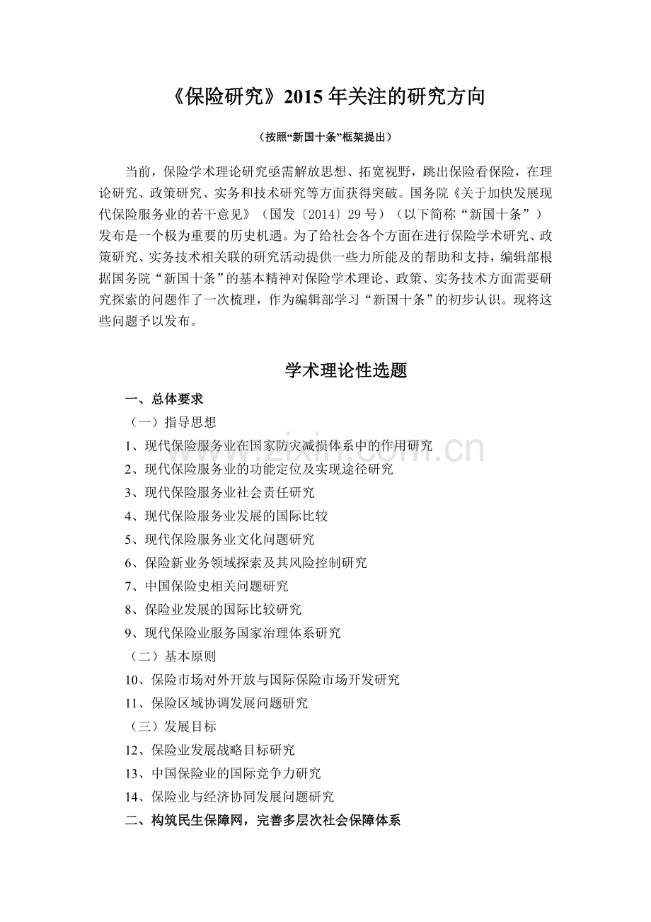 当前,保险学术理论研究亟需解放思想、拓宽视野,跳出保险看保险,在理论研究、政策研究、实务和技术研究等方面获得突破。国务院《关于加快发展现代保险服务业的若干意见》(国发〔2014〕29号)(以下简称“新国十条”)发布是一个极为重要的历史机遇。为了给社会各个方面在进行保险学术研究、政策研究、实务技术相关联的研究活动提供一些力所能及的帮助和支持,编辑部根据国务院“新国十条”的基本精神对保险学术理论、政策、实务技术方面需要研究探索的问题作了一次梳理,作为编辑部学习“新国十条”的初步认识。现将这些问题予以发布。