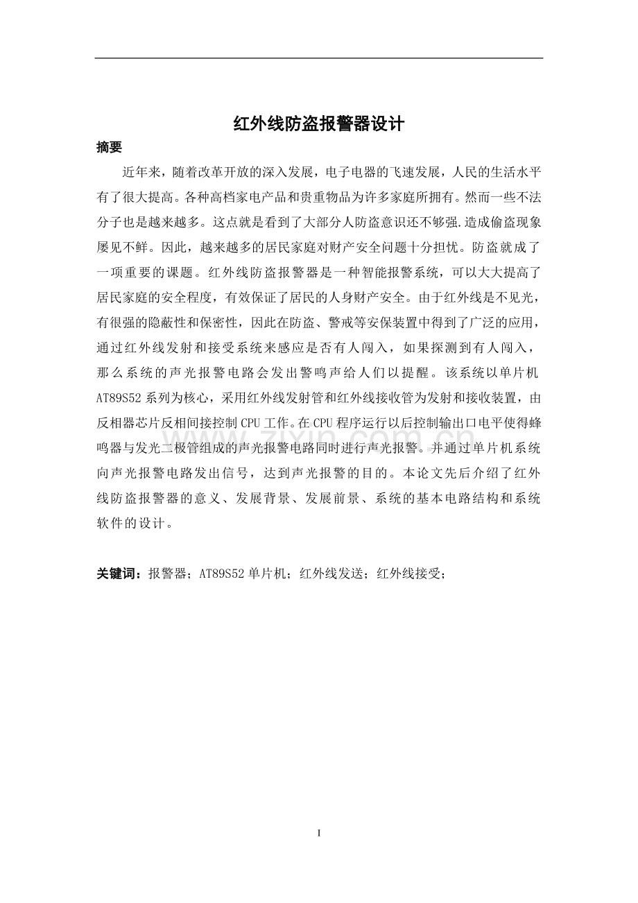 In recent years, with the deepening of reform and opening-up, electronic and electrical appliances rapid development, people's living standard has been greatly improved. A variety of high-grade household electrical appliances and the valuables have for many families. However, some lawless elements are also more and more. This is seen most security awareness is not strong enough. Causing steal phenomenon it is often seen. Therefore, more and more households in property safety is concerned about. Security has become an important topic. Infrared anti-theft alarm is a kind of intelligent alarm system, can greatly improve the safety degree of the households, effectively guarantee the residents' personal and property safety. Because infrared is not exposed to light, has strong confidentiality and secrecy, therefore in security, alert security device has been widely used, through the infrared transmitting and receiving system for sensing whether someone is breaking into, if the detected someone broke in, then the system will send out alarm sound and light alarm circuit sounds to the people to remind. The system based on singlechip AT89S52 series as the core, using the infrared emission tube and the infrared receiving tube for transmitting and receiving device, by an inverter inverting indirect control CPU chip. In the CPU program to run after the control of output level makes the buzzer and the light emitting diode comprising an acousto-optic alarm circuit at the same time the sound and light alarm. And through the single chip microcomputer system to sound and light alarm circuit sends out signals to alarm, the purpose of. This paper has introduced the infrared anti-theft alarm significance, development background, development prospects, system basic circuit structure and the software system design.