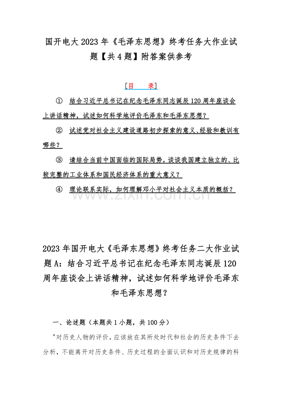 国开电大2023年《毛泽东思想》终考任务大作业试题【共4题】附答案供参考