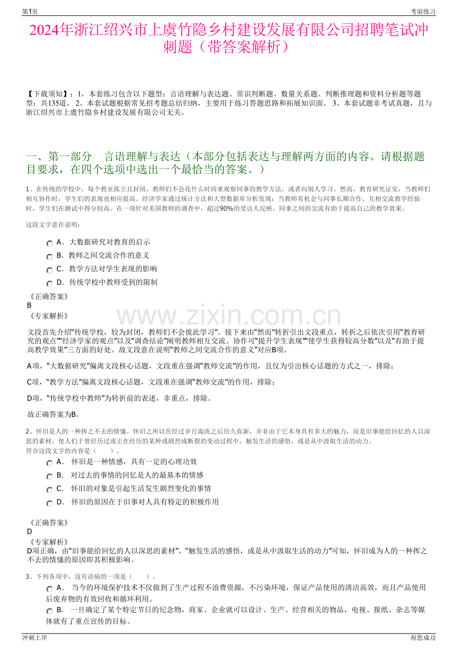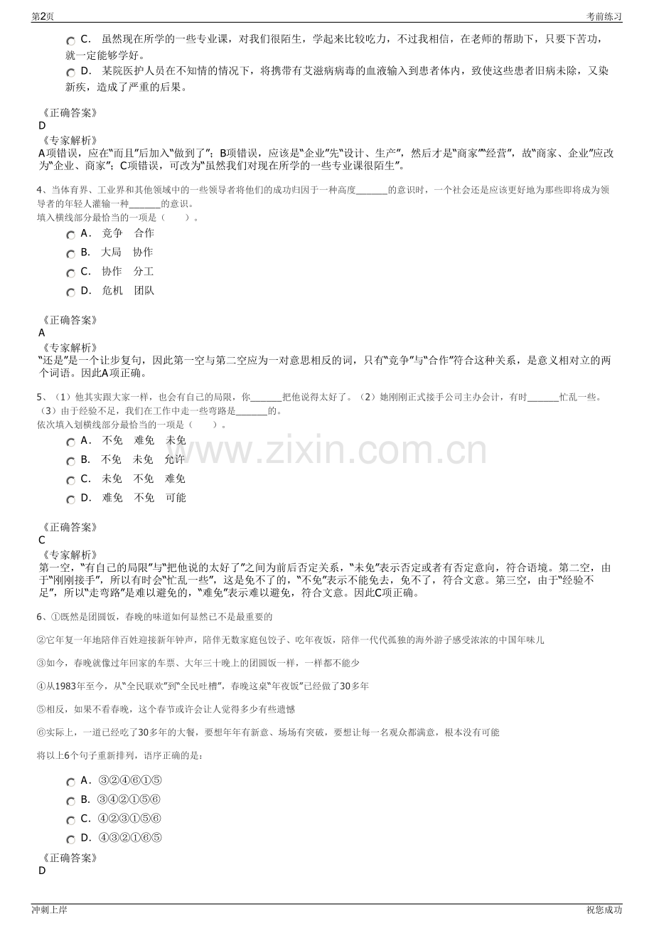 2024年浙江绍兴市上虞竹隐乡村建设发展有限公司招聘笔试冲刺题(带答案解析)【下载须知】:1,本套练习包含以下题型:言语理解与表达题、常识判断题、数量关系题、判断推理题和资料分析题等题型;共135道。2、本套试题根据常见招考题总结归纳,主要用于练习答题思路和拓展知识面。3、本套试题非考试真题,且与浙江绍兴市上虞竹隐乡村建设发展有限公司无关。一、第一部分言语理解与表达(本部分包括表达与理解两方面的内容。请根据题目要求,在四个选项中选出一个最恰当的答案。)1、在传统的学校中,每个教室孤立且封闭,教师们不会花什么时间来观察同事的教学方法,或者向别人学习。然而,教育研究证实,当教师们相互协作时,学生们的表现也相应提高。经济学家通过统计方法和大型数据库分析发现:当教师有机会与同事长期合作、互相交流教学经验时,学生们在测试中得分较高。在一项针对美国教师的调查中,超过90%的受访人反映,同事之间的交流有助于提高自己的教学效果。这段文字意在说明:A大数据研究对教育的启示 B教师之间交流合作的意义 C教学方法对学生表现的影响 D传统学校中教师受到的限制正确答案B专家解析文段首先介绍“传统学校,较为封闭,教师们不会彼此学习”。接下来由“然而”转折引出文段重点,转折之后依次引用“教育研究的观点”“经济学家的观点”以及“调查结论”阐明教师相互交流、协作可“提升学生表现”“使学生获得较高分数”以及“有助于提高教学效果”三方面的好处。故文段意在说明“教师之间交流合作的意义”对应B项。A项,“大数据研究”偏离文段核心话题,文段重在强调“教师交流”的作用,且仅为引出核心话题的方式之一,排除;C项,“教学方法”偏离文段核心话题,文段重在强调“教师交流”的作用,排除;D项,“传统学校中教师”为转折前的表述,非重点,排除。故正确答案为B。2、怀旧是人的一种挥之不去的情愫。怀旧之所以在经过岁月淘洗之后历久弥新,并非由于它本身具有多大的魅力,而是旧事能给回忆的人以深思的素材,使人们于曾经历过或正在经历的某种或剧烈或断裂的变动过程中,触发生活的感悟,或是从中汲取生活的动力。符合这段文字的内容是()。A 怀旧是一种情感,具有一定的心理功效 B 对过去的事情的回忆是人的最基本的情感 C 怀旧的对象是引起生活发生剧烈变化的事情 D 怀旧的原因在于旧事对人具有特定的积极作用正确答案D专家解析D项正确,由“旧事能给回忆的人以深思的素材”、“触发生活的感悟,或是从中汲取生活的动力”可知,怀旧成为人的一种挥之不去的情愫的原因即其积极影响。3、下列各项中,没有语病的一项是()。A 当今的环境保护技术不仅做到了生产过程不浪费资源,不污染环境,保证产品使用的清洁高效,而且产品使用后废弃物的有效回收和循环利用。B 一旦确定了某个特定节日的纪念物,商家、企业就可以设计、生产、经营相关的物品,电视、报纸、杂志等媒体就有了重点宣传的目标。第1页考前练习冲刺上岸祝您成功 C 虽然现在所学的一些专业课,对我们很陌生,学起来比较吃力,不过我相信,在老师的帮助下,只要下苦功,就一定能够学好。D 某院医护人员在不知情的情况下,将携带有艾滋病病毒的血液输入到患者体内,致使这些患者旧病未除,又染新疾,造成了严重的后果。正确答案D专家解析A项错误,应在“而且”后加入“做到了”;B项错误,应该是“企业”先“设计、生产”,然后才是“商家”“经营”,故“商家、企业”应改为“企业、商家”;C项错误,可改为“虽然我们对现在所学的一些专业课很陌生”。4、当体育界、工业界和其他领域中的一些领导者将他们的成功归因于一种高度_的意识时,一个社会还是应该更好地为那些即将成为领导者的年轻人灌输一种_的意识。填入横线部分最恰当的一项是()。A 竞争合作 B 大局协作 C 协作分工 D 危机团队正确答案A专家解析“还是”是一个让步复句,因此第一空与第二空应为一对意思相反的词,只有“竞争”与“合作”符合这种关系,是意义相对立的两个词语。因此A项正确。5、(1)他其实跟大家一样,也会有自己的局限,你_把他说得太好了。(2)她刚刚正式接手公司主办会计,有时_忙乱一些。(3)由于经验不足,我们在工作中走一些弯路是_的。依次填入划横线部分最恰当的一项是()。A 不免难免未免 B 不免未免允许 C 未免不免难免 D 难免不免可能正确答案C专家解析第一空,“有自己的局限”与“把他说的太好了”之间为前后否定关系,“未免”表示否定或者有否定意向,符合语境。第二空,由于“刚刚接手”,所以有时会“忙乱一些”,这是免不了的,“不免”表示不能免去,免不了,符合文意。第三空,由于“经验不足”,所以“走弯路”是难以避免的,“难免”表示难以避免,符合文意。因此C项正确。6、既然是团圆饭,春晚的味道如何显然已不是最重要的它年复一年地陪伴百姓迎接新年钟声,陪伴无数家庭包饺子、吃年夜饭,陪伴一代代孤独的海外游子感受浓浓的中国年味儿如今,春晚就像过年回家的车票、大年三十晚上的团圆饭一样,一样都不能少从1983年至今,从“全民联欢”到“全民吐槽”,春晚这桌“年夜饭”已经做了30多年相反,如果不看春晚,这个春节或许会让人觉得多少有些遗憾实际上,一道已经吃了30多