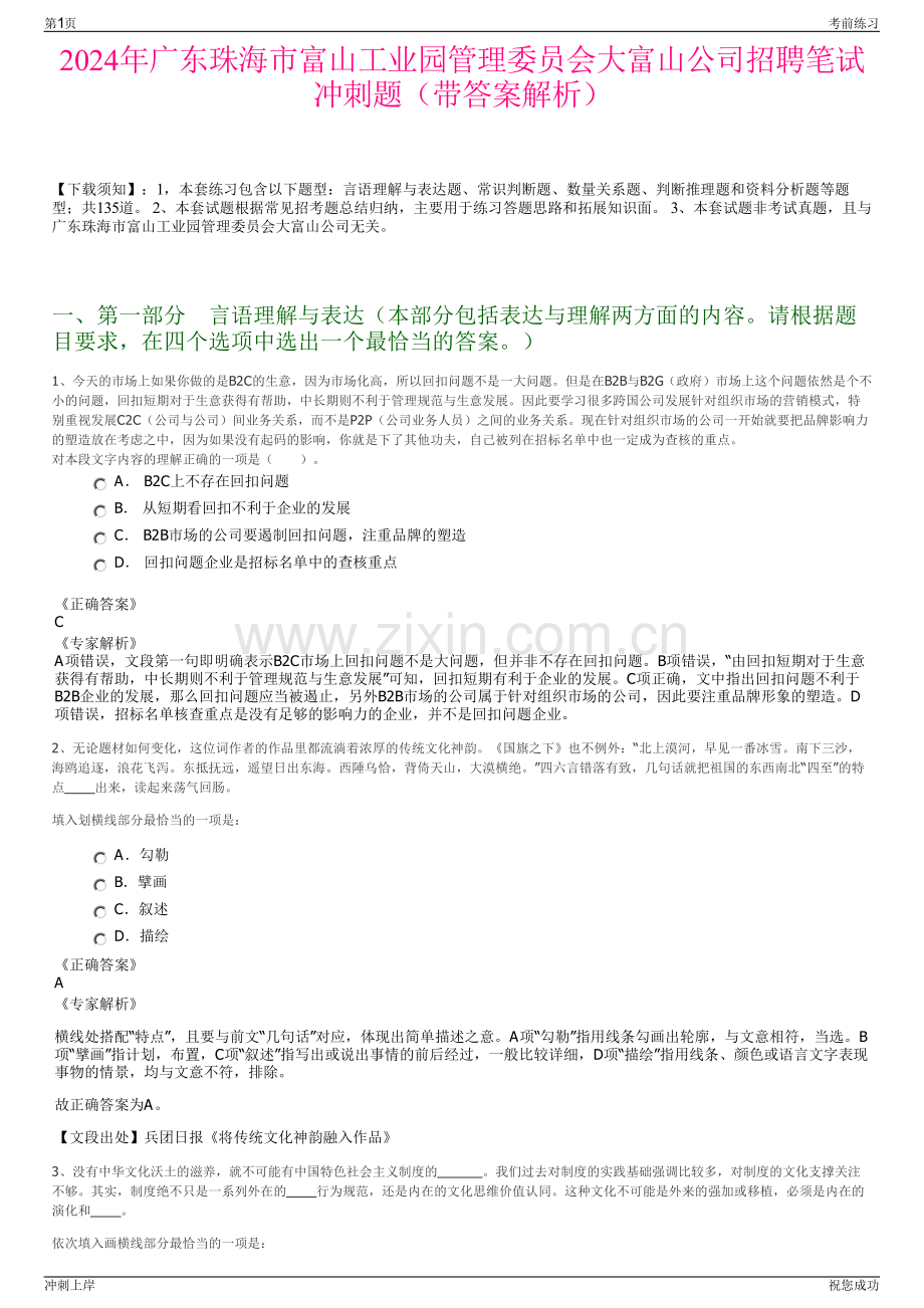 2024年广东珠海市富山工业园管理委员会大富山公司招聘笔试冲刺题(带答案解析)【下载须知】:1,本套练习包含以下题型:言语理解与表达题、常识判断题、数量关系题、判断推理题和资料分析题等题型;共135道。2、本套试题根据常见招考题总结归纳,主要用于练习答题思路和拓展知识面。3、本套试题非考试真题,且与广东珠海市富山工业园管理委员会大富山公司无关。一、第一部分言语理解与表达(本部分包括表达与理解两方面的内容。请根据题目要求,在四个选项中选出一个最恰当的答案。)1、今天的市场上如果你做的是B2C的生意,因为市场化高,所以回扣问题不是一大问题。但是在B2B与B2G(政府)市场上这个问题依然是个不小的问题,回扣短期对于生意获得有帮助,中长期则不利于管理规范与生意发展。因此要学习很多跨国公司发展针对组织市场的营销模式,特别重视发展C2C(公司与公司)间业务关系,而不是P2P(公司业务人员)之间的业务关系。现在针对组织市场的公司一开始就要把品牌影响力的塑造放在考虑之中,因为如果没有起码的影响,你就是下了其他功夫,自己被列在招标名单中也一定成为查核的重点。对本段文字内容的理解正确的一项是()。A B2C上不存在回扣问题 B 从短期看回扣不利于企业的发展 C B2B市场的公司要遏制回扣问题,注重品牌的塑造 D 回扣问题企业是招标名单中的查核重点正确答案C专家解析A项错误,文段第一句即明确表示B2C市场上回扣问题不是大问题,但并非不存在回扣问题。B项错误,“由回扣短期对于生意获得有帮助,中长期则不利于管理规范与生意发展”可知,回扣短期有利于企业的发展。C项正确,文中指出回扣问题不利于B2B企业的发展,那么回扣问题应当被遏止,另外B2B市场的公司属于针对组织市场的公司,因此要注重品牌形象的塑造。D项错误,招标名单核查重点是没有足够的影响力的企业,并不是回扣问题企业。2、无论题材如何变化,这位词作者的作品里都流淌着浓厚的传统文化神韵。国旗之下也不例外:“北上漠河,早见一番冰雪。南下三沙,海鸥追逐,浪花飞泻。东抵抚远,遥望日出东海。西陲乌恰,背倚天山,大漠横绝。”四六言错落有致,几句话就把祖国的东西南北“四至”的特点 出来,读起来荡气回肠。填入划横线部分最恰当的一项是:A勾勒 B擘画 C叙述 D描绘正确答案A专家解析横线处搭配“特点”,且要与前文“几句话”对应,体现出简单描述之意。A项“勾勒”指用线条勾画出轮廓,与文意相符,当选。B项“擘画”指计划,布置,C项“叙述”指写出或说出事情的前后经过,一般比较详细,D项“描绘”指用线条、颜色或语言文字表现事物的情景,均与文意不符,排除。故正确答案为A。【文段出处】兵团日报将传统文化神韵融入作品3、没有中华文化沃土的滋养,就不可能有中国特色社会主义制度的 。我们过去对制度的实践基础强调比较多,对制度的文化支撑关注不够。其实,制度绝不只是一系列外在的 行为规范,还是内在的文化思维价值认同。这种文化不可能是外来的强加或移植,必须是内在的演化和 。依次填入画横线部分最恰当的一项是:第1页考前练习冲刺上岸祝您成功 A勃勃生机 强制性 积淀 B枝繁叶茂 约束性 渗透 C历久弥新 指导性 转化 D欣欣向荣 系统性 升华正确答案A专家解析第一空,根据“没有中华文化沃土的滋养”可知,横线处体现中国特色社会主义制度发展好之意,且与“沃土”构成形象化对应,A项“勃勃生机”形容生命力旺盛的样子,B项“枝繁叶茂”形容枝叶繁密茂盛,D项“欣欣向荣”指草木长得茂盛,生机勃勃的样子,均符合文意,保留。C项“历久弥新”指经历长久的时间而更加鲜活,更加有活力,更显价值,无法与“沃土”构成形象化对应,不符合语境,排除。第二空,根据“这种文化不可能是外来的强加或移植”可知,横线处应体现制度绝不只是一系列强行规范性的约束,A项“强制性”指必须依照法律适用、不能以个人意志予以变更,B项“约束性”有限制、管束使不越出范围之意,均符合文意,保留。D项“系统性”强调的是整体性,与文意不符,排除。第三空,根据文意可知,横线处应体现文化的内在发展,A项“积淀”形容一些非物质化(如精神、品质、文化等)的积累过程,符合文意,当选。B项“渗透”指液体缓慢地透到里面或比喻一种思想或势力逐渐向其它方面扩展,无法体现文化的内在发展,排除。故正确答案为A。【文段出处】中国青年网迈向伟大复兴的制度自信4、关注受众、研究受众、服务受众,是互联网思维的一个鲜明特点。这与政治工作倡导以人为本的理念 。政治工作本质上是做人的工作,其实质就是一种受众至上的思维理念。填入画横线部分最恰当的一项是:A一脉相承 B相辅相成 C不谋而合 D并行不悖正确答案C专家解析横线前的指代词“这”指代前文中重视受众是互联网思维的鲜明特点,后文提到政治工作的实质同样也是一种受众至上的思维。由此可知,互联网思维和政治工作倡导以人为本的理念是一致的,二者是相契合的,均是在强调受众至上。C项“不谋而合”意为事前没有商量过而彼此意见或行动却完全一致,能够体现出互联网思维和政治工作的理念的高度一致性,符合文意,当选。A项“一脉相承”意为由一个血统或一个派别世代相传承袭下来,强调人或事物间的传承关系,文段中互联网思