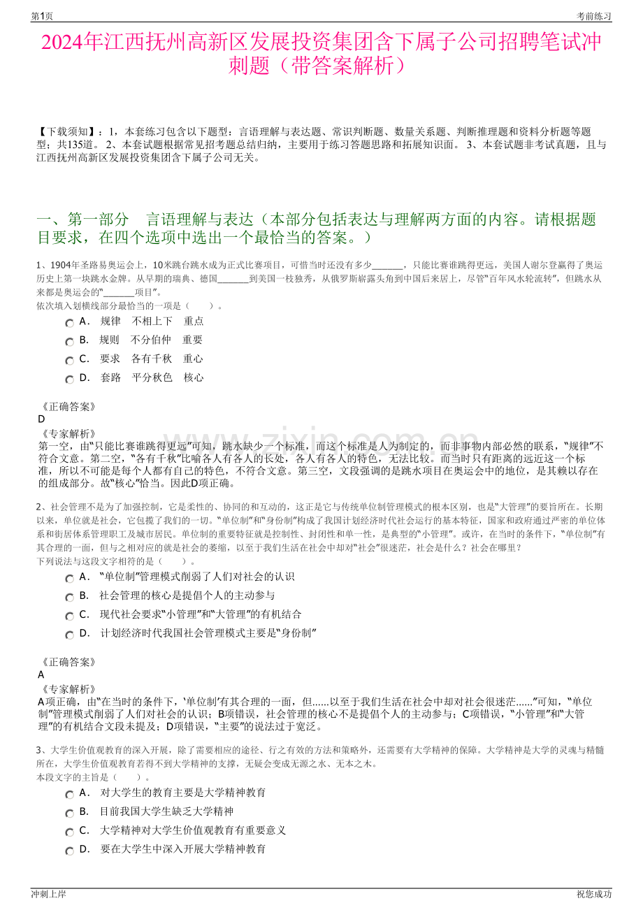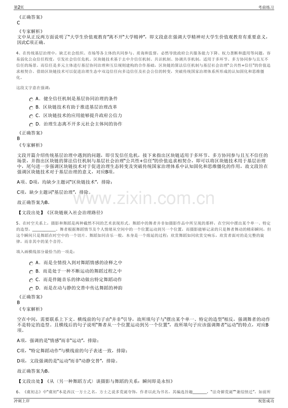 2024年江西抚州高新区发展投资集团含下属子公司招聘笔试冲刺题(带答案解析)【下载须知】:1,本套练习包含以下题型:言语理解与表达题、常识判断题、数量关系题、判断推理题和资料分析题等题型;共135道。2、本套试题根据常见招考题总结归纳,主要用于练习答题思路和拓展知识面。3、本套试题非考试真题,且与江西抚州高新区发展投资集团含下属子公司无关。一、第一部分言语理解与表达(本部分包括表达与理解两方面的内容。请根据题目要求,在四个选项中选出一个最恰当的答案。)1、1904年圣路易奥运会上,10米跳台跳水成为正式比赛项目,可惜当时还没有多少_,只能比赛谁跳得更远,美国人谢尔登赢得了奥运历史上第一块跳水金牌。从早期的瑞典、德国_到美国一枝独秀,从俄罗斯崭露头角到中国后来居上,尽管“百年风水轮流转”,但跳水从来都是奥运会的“_项目”。依次填入划横线部分最恰当的一项是()。A 规律不相上下重点 B 规则不分伯仲重要 C 要求各有千秋重心 D 套路平分秋色核心正确答案D专家解析第一空,由“只能比赛谁跳得更远”可知,跳水缺少一个标准,而这个标准是人为制定的,而非事物内部必然的联系,“规律”不符合文意。第二空,“各有千秋”比喻各人有各人的长处,各人有各人的特色,无法比较。而当时只有距离的远近这一个标准,所以不可能是每个人都有自己的特色,不符合文意。第三空,文段强调的是跳水项目在奥运会中的地位,是其赖以存在的组成部分。故“核心”恰当。因此D项正确。2、社会管理不是为了加强控制,它是柔性的、协同的和互动的,这正是它与传统单位制管理模式的根本区别,也是“大管理”的要旨所在。长期以来,单位就是社会,它包揽了我们的一切。“单位制”和“身份制”构成了我国计划经济时代社会运行的基本特征,国家和政府通过严密的单位体系和街居体系管理职工及城市居民。单位制的重要特征就是控制性、封闭性和单一性,是典型的“小管理”。或许,在当时的条件下,“单位制”有其合理的一面,但与之相对应的就是社会的萎缩,以至于我们生活在社会中却对“社会”很迷茫,社会是什么?社会在哪里?下列说法与这段文字相符的是()。A“单位制”管理模式削弱了人们对社会的认识 B 社会管理的核心是提倡个人的主动参与 C 现代社会要求“小管理”和“大管理”的有机结合 D 计划经济时代我国社会管理模式主要是“身份制”正确答案A专家解析A项正确,由“在当时的条件下,单位制有其合理的一面,但以至于我们生活在社会中却对社会很迷茫”可知,“单位制”管理模式削弱了人们对社会的认识;B项错误,社会管理的核心不是提倡个人的主动参与;C项错误,“小管理”和“大管理”的有机结合文段未提及;D项错误,“主要”的说法过于宽泛。3、大学生价值观教育的深入开展,除了需要相应的途径、行之有效的方法和策略外,还需要有大学精神的保障。大学精神是大学的灵魂与精髓所在,大学生价值观教育若得不到大学精神的支撑,无疑会变成无源之水、无本之木。本段文字的主旨是()。A 对大学生的教育主要是大学精神教育 B 目前我国大学生缺乏大学精神 C 大学精神对大学生价值观教育有重要意义 D 要在大学生中深入开展大学精神教育第1页考前练习冲刺上岸祝您成功正确答案C专家解析文中从正反两方面说明了“大学生价值观教育”离不开“大学精神”,即文段意在强调大学精神对大学生价值观教育有重要意义,因此C项正确。4、在传统基层治理中,缺乏社会组织、市场等各主体的共同参与、质询和监督,必然导致政府公共服务能力下降、权力垄断和滥用等问题,容易弱化公众信任程度,引发社会信任危机。区块链技术基于去中介信任机制、共识机制、协调共享机制,适用于多环节、多方协同参与且互不信任的场景。而信任是多元主体进行基层协同治理和互信规则建构的合作基础,区块链的算法信任机制与基层社会治理“公共性+信任”的价值追求相契合。借助区块链技术可以促进治理生态中双边信任向多边信任及社会公信的转变,突破传统国家治理体系所形成的认知固化和思维僵化。这段文字意在强调:A健全信任机制是基层协同治理的条件 B区块链技术有助于推进基层治理改革 C区块链技术的应用能够提升政府公信力 D治理生态离不开多元社会主体间的协作正确答案B专家解析文段开篇介绍传统基层治理中遇到的问题,即引发信任危机,接下来指出区块链适用于多环节、多方协同参与且互不信任的场景,并指出区块链的算法信任机制与基层社会治理“公共性+信任”的价值追求相契合,即可以将区块链技术用于基层治理中,尾句进一步强调区块链技术对于促进治理生态转变及突破传统国家治理体系中认知固化和思维僵化的作用,故文段旨在强调区块链技术对于基层治理的意义,对应B项。A项、D项,均缺少主题词“区块链技术”,排除;C项,缺少主题词“基层治理”,排除。故正确答案为B。【文段出处】区块链嵌入社会治理路径5、在时空关系上,摄影和舞蹈是两种截然不同的艺术表现形式。舞蹈中的舞者并非如摄影作品中所呈现的那样,在空间中摆出某个单一、特定的造型,。舞者根据舞蹈情节及个人情绪从空间中的一个位置运动到另一个位置,而摄影能够记录的只是舞者舞动的精彩瞬间,但这