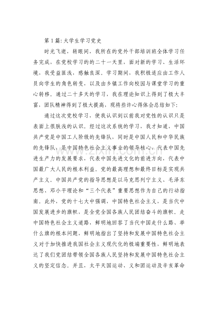 第 1 篇:大学生学习党史 时光飞逝,转眼间,我所在的党外干部培训班全体学习任务完成,在党校学习的的二十一天里,面对新的学习、生活环境,我受益匪浅,感触良深。学习期间,我积极适应由工作人员向学生的角色转变,以及由乡镇工作向校园与课堂学习的重心转移。通过二十多天的学习,我在理论知识上得到了极大丰富,团队精神得到了极大提高,现将些许心得体会总结如下:通过这次党校学习,使我认识到以前我对党性的认识只是表面上很肤浅的认识。经过这次系统的学习,我才知道,中国共产党是中国工人阶级的先锋队,同时是中国人民和中华民族的先锋队,是中国特色社会主义事业的领导核心,代表中国先进生产力的发展要求,代表中国先进文化的前进方向,代表中国最广大人民的根本利益。党的最高理想和最终目标是实现共产主义。中国共产党的指导思想是以马克思列宁主义、毛泽东思想、邓小平理论和“三个代表”重要思想作为自己的行动指南。此外,党的十七大中强调,中国特色社会主义,是当代中国发展进步的旗帜,是全党全国各族人民团结奋斗的旗帜。走中国特色社会主义道路,鲜明地回答了当代中国走什么路、举什么旗的根本问题,鲜明地指出了坚持和发展中国特色社会主义对于加快推进我国社会主义现代化的极端重要性,鲜明地表达了我们党团结带领全国各族人民坚持和发展中国特色社会主义的坚定信念。并且,太平天国运动、义和团运动及辛亥革命的失败,都说明了没有共产党就没有新中国,只有在共产党的领导下,我们的国家才能日益富强,人民才能安居乐业。通过这次党校学习,也使我对“三个代表”重要思想的认识有了进一步的升华。“三个代表”,即中国共产党要始终代表中国先进生产力发展要求,始终代表中国先进文化的前进方向,始终代表中国最广大人民的根本利益。“三个代表”作为党的性质的重要内容,是有着十分具体的内容和要求的,即在经济上建设高度的社会主义物质文明,就要代表中国先进生产力的发展要求;在文化上,建设高度的社会主义精神文明,就要代表中国先进文化的前进方向;在政治上,建设高度的社会主义政治文明,就要代表最广大人民的根本利益。做到了这“三个代表”,中国共产党就有了立党之本、执政之基、力量之源;做到了这“三个代表”,中国共产党就能引领时代潮流,推进社会发展。总之,“三个代表”是相互联系、相互促进的一个统一的整体。我们要始终以“三个代表”重要思想为指导,始终保持党员的先进性,更好地肩负起历史和时代赋予的庄严使命,更加朝气蓬勃地团结带领全国各族人民全面建设小康社会。三个代表中的每一个代表,都有其相对独立的丰富内涵。但这三者之间又密切联系,构成辩证统一的整体。其中先进生产力是历史发展的决定性力量,是先进文化的基础;先进文化对经济会起巨大的促进作用,先进生产力要求有先进文化与之相适应;人民群众是历史的创造者,是先进生产力和先进文化的推动者;而先进生产力和先进文化又从根本上体现和满足最广大人民的根本利益。在党员的具体要求中明确指出:中国共产党党员必须全心全意为人民服务,不惜牺牲个人的一切,为实现共产主义奋斗终身。三个代表也始终要求我们坚持为人民服务的宗旨。党风问题、党同人民群众联系问题是关系党生死存亡的问题。我们的党来源于人民、植根于人民、服务于人民,是在人民群众中成长、发展、壮大起来的。人民群众是我们的力量源泉和胜利之本。密切联系群众是我们党的性质和宗旨的体现。我们党从最初成立时的五十多名党员发展到现在的六千多万党员,成为领导一个十多亿人口的社会主义大国的执政党,其中最根本的一条,就是我们党始终代表中国先进社会生产力的发展要求,始终代表中国先进文化的前进方向,始终代表中国最广大人民的根本利益,并且为了人民的利益付出了最大的牺牲,赢得了人民群众的信赖和支持。我们也看到了我们很多优秀党员的感人肺腑的先进事迹,他们一心一意为人民,为人民付出一切。我认识到:大学生党员必须努力学习马克思主义理论,不断提高思想政治觉悟,树立马克思主义的世界观、人生观和价值观,始终保持党员的先进性。同时要刻苦学习科学、文化和业务知识,努力在工作和学习中紧跟时代发展的步伐,以实际行动做一名合格的共产党员。第 2 篇:大学生学习党史 通过学习共产党的百年历史,我了解到中国共产党走过的路程十分艰辛。在共产党成立之初,中华大地千疮百孔,满目疮痍,内有军阀连连混战,外有帝国主义炮火轰打。但是,为了拯救民众于水火的,共产党的早期领袖们与伟大的革命先烈们,顶住了重重的压力,在 1921 年创立了伟大的中国共产党。中国共产党的创立是中国近代开天辟地的大事,自从有了中国共产党,中国人民就有了灯塔。为了挽救国家和人民,中国共产党打响了“八一”南昌起义第一枪,我们有了自己的军队,我们用正义的武装去对付蒋介石非正义的反动武装,井冈山革命根据地的创立、农村包围城市的正确主张,都在实践中取得了巨大成果。重温共产党从成立以来,为中华民族和中国人民建立的不朽功勋,我体会到:只有在中国共产党的领导下,坚持中国特色社会主义道路,才能使我们的祖国繁荣昌盛,才能实现中华民族的伟大复兴