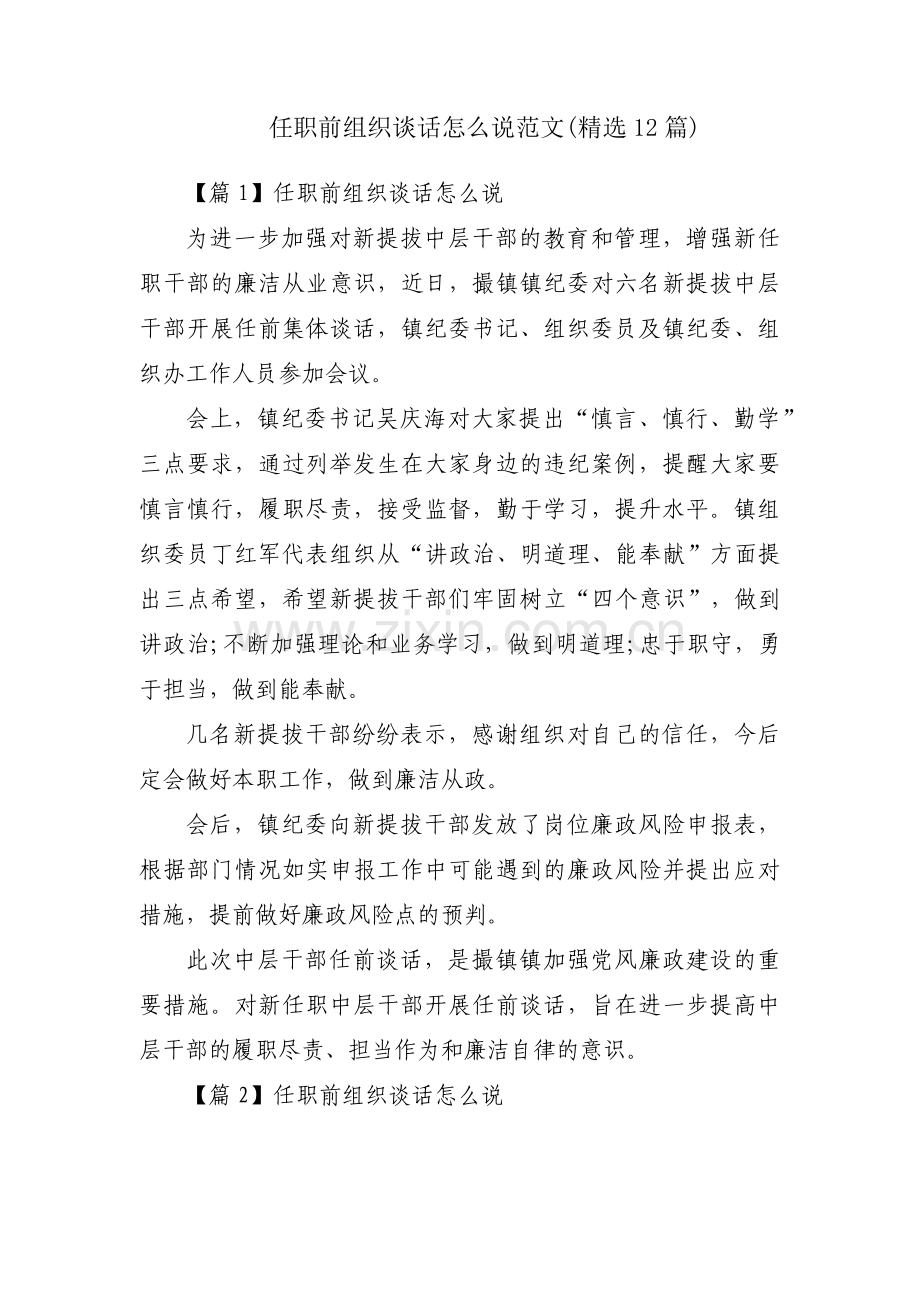 任职前组织谈话怎么说范文(精选 12 篇)【篇 1】任职前组织谈话怎么说 为进一步加强对新提拔中层干部的教育和管理,增强新任职干部的廉洁从业意识,近日,撮镇镇纪委对六名新提拔中层干部开展任前集体谈话,镇纪委书记、组织委员及镇纪委、组织办工作人员参加会议。会上,镇纪委书记吴庆海对大家提出“慎言、慎行、勤学”三点要求,通过列举发生在大家身边的违纪案例,提醒大家要慎言慎行,履职尽责,接受监督,勤于学习,提升水平。镇组织委员丁红军代表组织从“讲政治、明道理、能奉献”方面提出三点希望,希望新提拔干部们牢固树立“四个意识”,做到讲政治;不断加强理论和业务学习,做到明道理;忠于职守,勇于担当,做到能奉献。几名新提拔干部纷纷表示,感谢组织对自己的信任,今后定会做好本职工作,做到廉洁从政。会后,镇纪委向新提拔干部发放了岗位廉政风险申报表,根据部门情况如实申报工作中可能遇到的廉政风险并提出应对措施,提前做好廉政风险点的预判。此次中层干部任前谈话,是撮镇镇加强党风廉政建设的重要措施。对新任职中层干部开展任前谈话,旨在进一步提高中层干部的履职尽责、担当作为和廉洁自律的意识。【篇 2】任职前组织谈话怎么说*:根据党支部的安排,我们两个谈谈心,交流一下对开展学习科学发展观的认识,开展批评与自我批评。怎样样,您先谈一谈?朱光明:这次活动对我来讲是十分难得的学习和提高的机会,这给我的党内生活开了个好头。经过参加学习教育,也真的感到提高很快,收获很大。这样系统地学习科学发展和“三个代表”重要思想的关系,科学发展和党的理论知识,过去还从来没有过。以往总感到自我表现还是挺优秀的,经过党性分析,查摆问题,才真正找到了不足,看清了努力的方向。比如说,做学习型、知识型党员啦,增强创新意识、进取精神啦,高标准、严要求啦,立足岗位处处发挥模范带头作用啦,等等。差距还大的很哩,真是不学不明白,不学不得了。*:从您的谈话中,能真切地感受到,你的学习态度很认真、提高很明显,收获也很大。我虽是一位有几年党龄的党员,但和你相比明显地有差距。我们的工作很忙,所以,团体学习有时候参加不了,有时参加了也紧持不到底。这次教育虽然也学完了必学资料,但还是不深不透。再一方面,我局的同志,我平时与他们谈心较少,对他们在生活上关心不够。另外,我还得按你上头说的那几个方面去努力,咱做党员的要让人家看到处处比别人先进才行。*:您平时工作很出色,一向是我学习的榜样。您是老党员,以后对我多帮忙啊。【篇 3】任职前组织谈话怎么说 主任、各位副主任、秘书长,各位委员:今天,我怀着十分激动和崇敬的心情,有机会站在这庄严而神圣的会场,向市人大常委会作任职前发言,接受市人大常委会的审议和挑选。如果市人大常委会能通过对我的任命,我将认真依法履行职责,忠于职守,爱岗敬业,开拓创新,决不辜负党和人民的信任,不辜 负市人大常委会的选择和重托。市人大常委会如能通过对我的任命,任期内我的工作目标是“五个致力于”:一是致力于充分发挥司法行政职能,全力维护社会稳定,为改革和发展创造良好的法治环境。紧密配合“严打”整治斗争,大力开展法制宣传教育活动,努力从根本上预防和减少违法犯罪。要始终坚持“惩罚与改造相结合,以改造人为宗旨”和“教育、感化、挽救”的工作方针,加强对监所依法、严格、文明、科学管理,积极推进现代化监所创建活动,努力建立确保监所安全稳定的高效机制。抓好落实刑释解教人员的安置帮教工作,配合“严打”整治,减少社会乱源,并深入开展“无刑释解教人员重新犯罪乡镇”活动。积极组织律师开展“严打”刑事辩护,维护司法公正。二是致力于全面开展“四五”普法和依法治理工作,不断推进依法治市进程。根据党中央、全国人大常委会、国务院和省委、省人大常委会、省政府及市委、市人大常委会、市政府的统一部署,在认真总结“三五”普法和依法治理工作的基础上,大力开展多形式、全方位的法制宣传教育活动,不断增强广大公民社会主义民主法制意识,努力做到学法、知法、守法、用法、护法。实现由提高全民法律意识向提高全民法律素质的转变,实现由注重依靠行政手段管理向注重运用法律手段管理的转变,全面提高社会法治化管理水平。三是致力于抓好基层基础工作,大力开展“民安工程”活动,不断强化基层司法行政职能。要按照中共中央关于进一步加强综合治理工作的意见的要求和“强基层,打基础”的工作方针,建设好基层司法机构和“司法调解中心”,配齐、配强乡镇司法专干,完善办公办案条件,充分发挥人民调解工作在维护社会稳定中的基础性作用。做好矛盾排查纠纷调解工作,努力把问题解决在基层,确保基层社会政治稳定。四是致力于抓好法律服务工作,为全市的改革和发展提供有力的法制保障。充分发挥律师、公证、基层法律服务的职能作用,紧密围绕我市“十五”经济发展目标和我国加入“wto”的需要,以“三个代表”重要思想为指导,以“送法下乡进厂”、“服务上门到户”为主要内容,充分发挥“148”法律服务专线和法律援助中心的作用,积极组织广大法律工作者和司法行政队伍深入基层开展法律服务工作,为推进我市工业化进程提供优质
