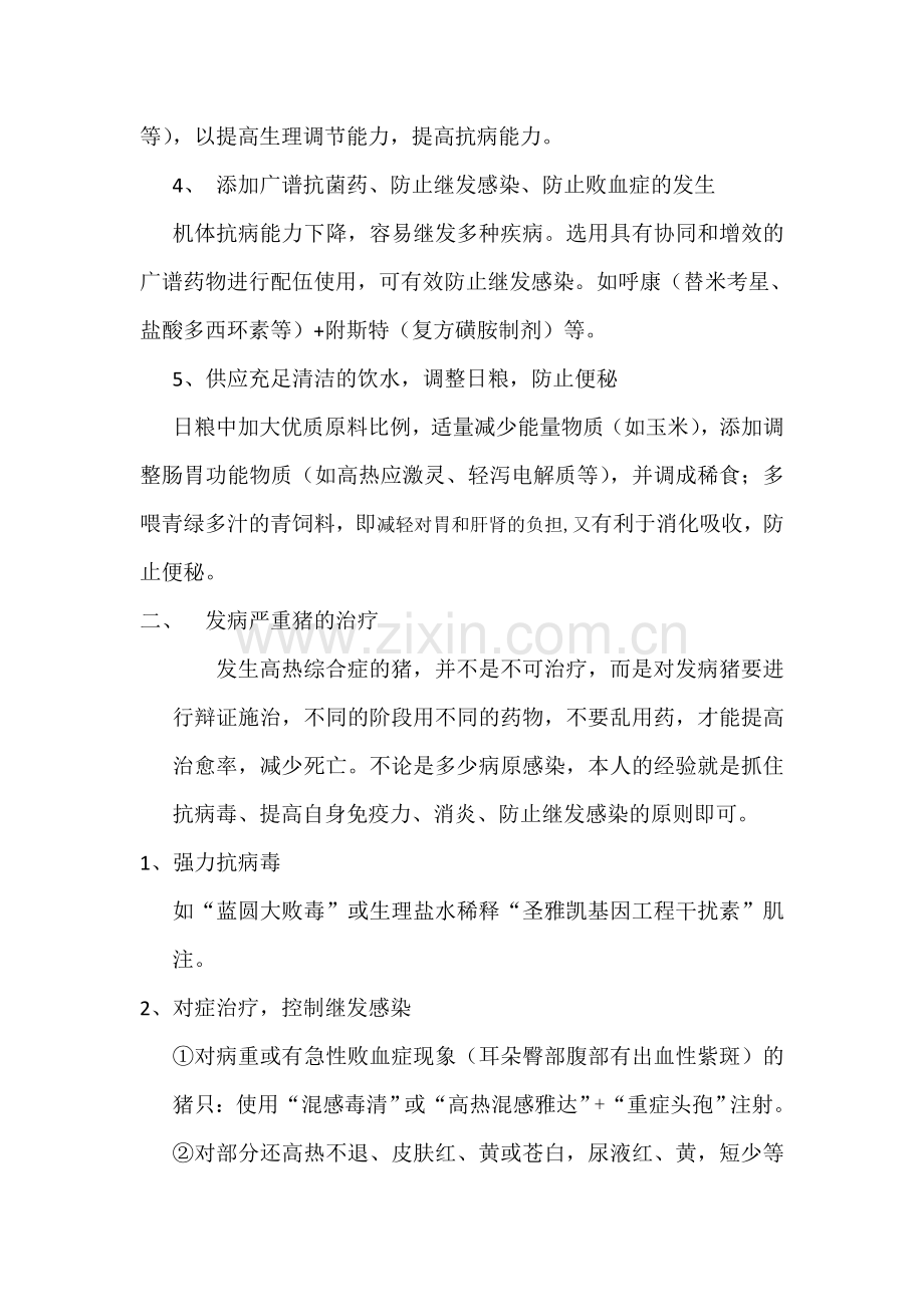 发生高热综合症的猪,并不是不可治疗,而是对发病猪要进行辩证施治,不同的阶段用不同的药物,不要乱用药,才能提高治愈率,减少死亡。不论是多少病原感染,本人的经验就是抓住抗病毒、提高自身免疫力、消炎、防止继发感染的原则即可。