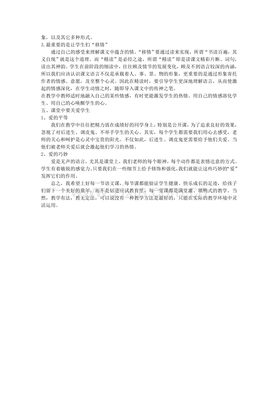 总之,我希望上好每一节语文课,每节课都能验证学生健康、快乐成长的足迹,给孩子们留下一个美好的童年。而不是钻进应试教育里,每一堂课都是满堂灌、填鸭式的教学。当然,教学有法,教无定法,可以说没有一种教学方法是最好的,只能在实际的教学环境中灵活运用。