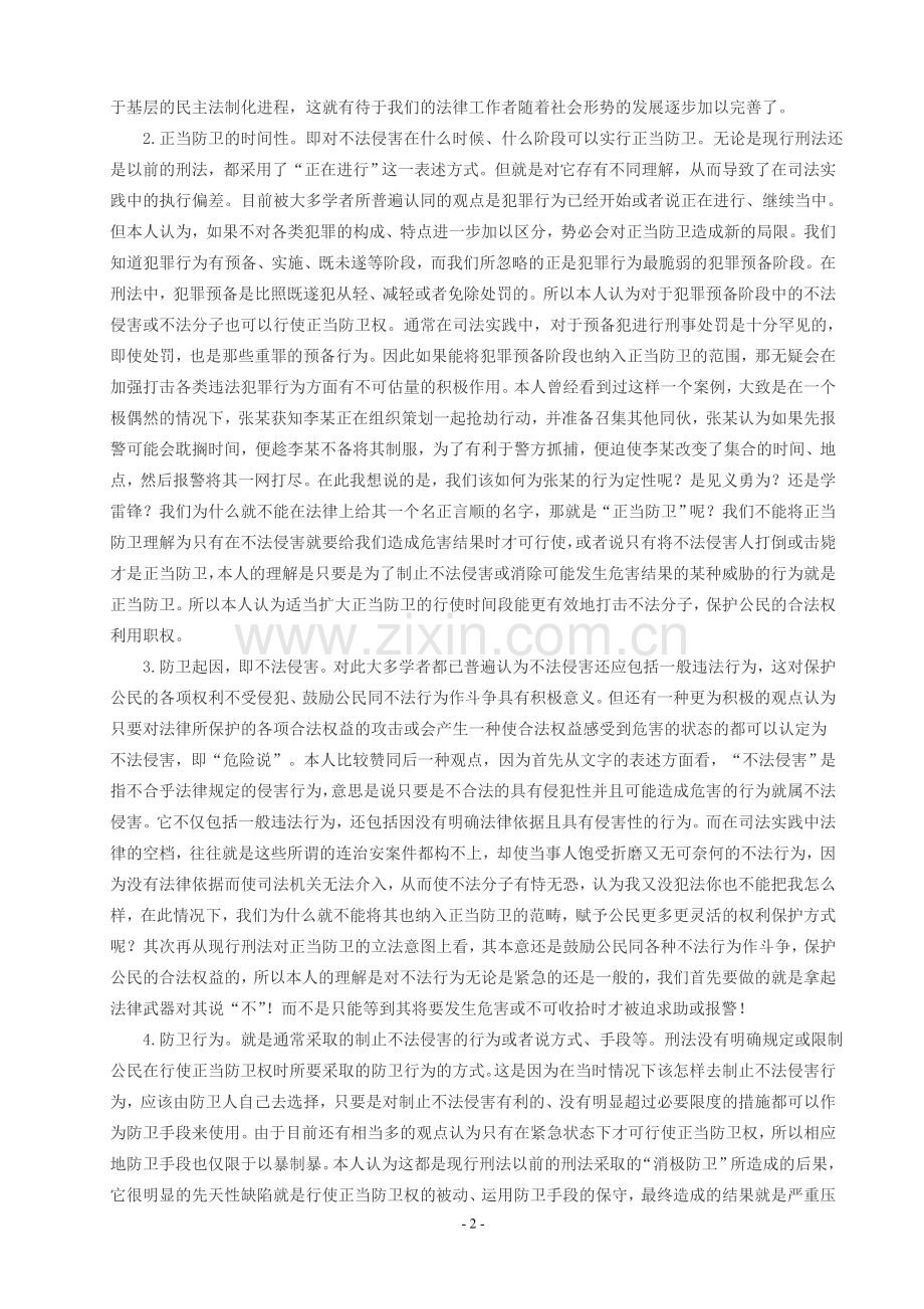 关于正当防卫,我国在1997年3月14日由全国人大修订颁布的《中华人民共和国刑法》第二十条明确规定为:为了使国家、公共利益、本人或他人的人身、财产和其他权利免受正在进行的不法侵害,而采取的制止不法侵害的行为,对不法侵害人造成损害的,属于正当防卫,不负刑事责任。正当防卫明显超过必要限度造成重大损害的,应当负刑事责任,但是应当减轻或者免除处罚。对正在进行行凶,杀人,抢劫,强奸,绑架以及其他严重危及人身安全的暴力犯罪,采取防卫行为,造成不法侵害人伤亡的,不属于防卫过当,不负刑事责任。在近几年的司法理论及实践当中,对其成立的各种条件及防卫过当和无限防卫权等问题发生的争论较多,在本文中我将着重阐述几点自己对正当防卫的理解及认识,如有不当之处,涵请各位老师给予指正。
