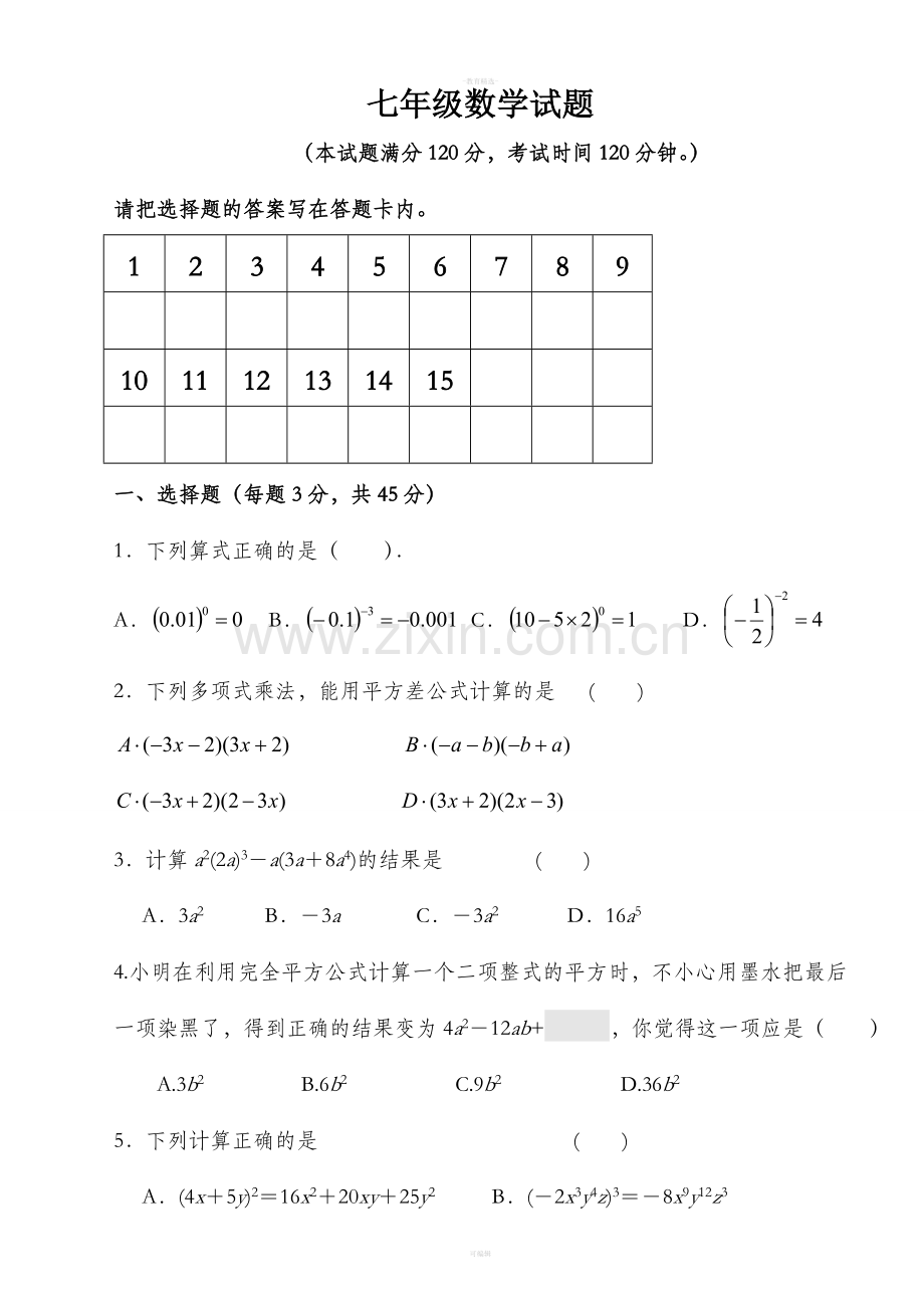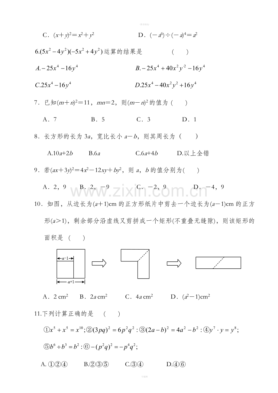 2.下列多项式乘法,能用平方差公式计算的是 ( )